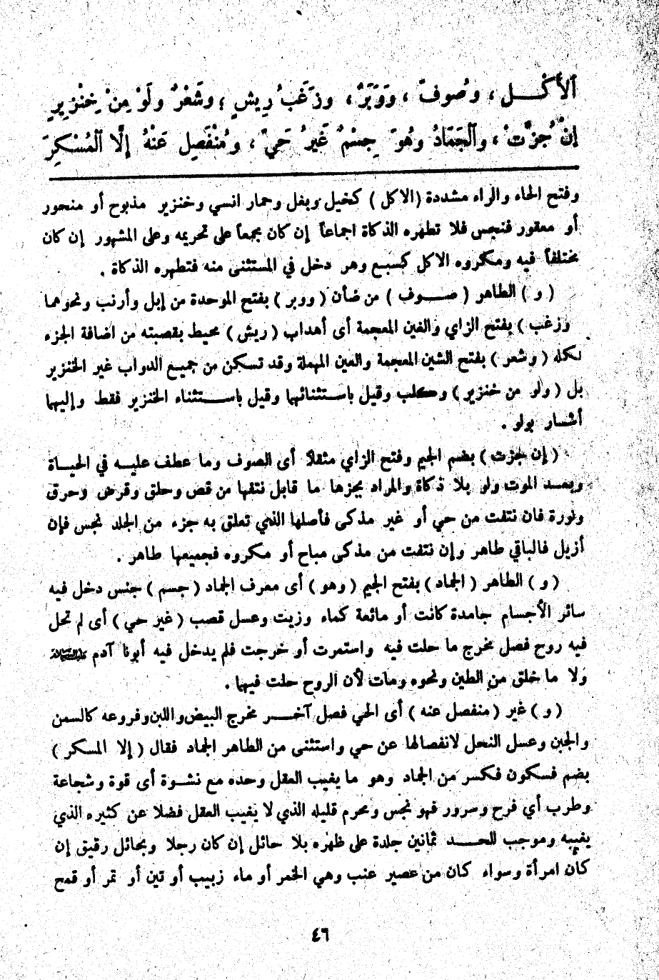 (وَ) غَيْرُ (مُنْفَصِلٍ عَنْهُ) أَيْ الْحَيِّ؛ فَصْلٌ آخَرُ مُخْرِجٌ الْبَيْضَ وَاللَّبَنَ وَفُرُوعَهُ كَالسَّمْنِ، وَالْجُبْنِ وَعَسَلِ النَّحْلِ لِانْفِصَالِهَا عَنْ حَيٍّ وَاسْتَثْنَى مِنْ الطَّاهِرِ الْجَمَادِ فَقَالَ (إلَّا الْمُسْكِرَ) بِضَمٍّ فَسُكُونٍ فَكَسْرٍ مِنْ الْجَمَادِ وَهُوَ مَا يُغَيِّبُ الْعَقْلَ وَحْدَهُ مَعَ نَشْوَةٍ أَيْ قُوَّةٍ وَشَجَاعَةٍ وَطَرَبٍ، أَيْ فَرَحٍ وَسُرُورٍ فَهُوَ نَجِسٌ وَمُحَرَّمٌ قَلِيلُهُ الَّذِي لَا يُغَيِّبُ الْعَقْلَ فَضْلًا عَنْ كَثِيرِهِ الَّذِي يُغَيِّبُهُ، وَمُوجِبٌ لِلْحَدِّ ثَمَانِينَ جَلْدَةً عَلَى ظَهْرِهِ بِلَا حَائِلٍ إنْ كَانَ رَجُلًا وَبِحَائِلٍ رَقِيقٍ إنْ كَانَ امْرَأَةً وَسَوَاءٌ كَانَ مِنْ عَصِيرِ عِنَبٍ وَهِيَ الْخَمْرُ، أَوْ مَاءِ زَبِيبٍ، أَوْ تِينٍ، أَوْ تَمْرٍ، أَوْ قَمْحٍ