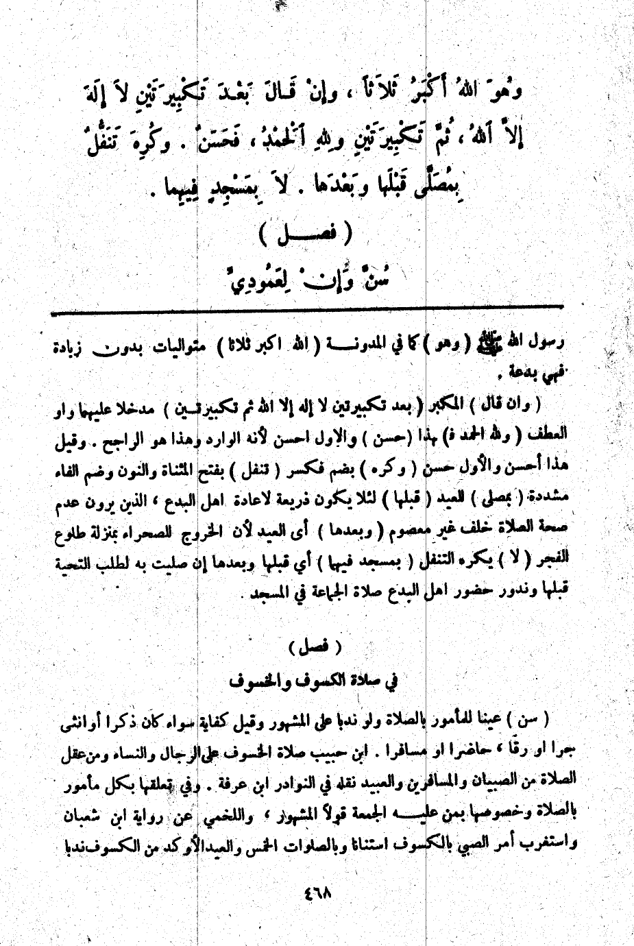 (فَصْلٌ) فِي صَلَاةِ الْكُسُوفِ وَالْخُسُوفِ. (سُنَّ) عَيْنًا لِلْمَأْمُورِ بِالصَّلَاةِ وَلَوْ نَدْبًا عَلَى الْمَشْهُورِ، وَقِيلَ كِفَايَةً سَوَاءٌ كَانَ ذَكَرًا أَوْ أُنْثَى حُرًّا أَوْ رِقًّا، حَاضِرًا أَوْ مُسَافِرًا. ابْنُ حَبِيبٍ. صَلَاةُ الْخُسُوفِ عَلَى الرِّجَالِ وَالنِّسَاءِ وَمَنْ عَقَلَ الصَّلَاةَ مِنْ الصِّبْيَانِ وَالْمُسَافِرِينَ وَالْعَبِيدِ نَقَلَهُ فِي النَّوَادِرِ ابْنُ عَرَفَةَ. وَفِي تَعَلُّقِهَا بِكُلِّ مَأْمُورٍ بِالصَّلَاةِ وَخُصُوصِهَا بِمَنْ عَلَيْهِ الْجُمُعَةُ قَوْلَا الْمَشْهُورِ وَاللَّخْمِيِّ عَنْ رِوَايَةِ ابْنِ شَعْبَانَ وَاسْتَغْرَبَ أَمْرَ الصَّبِيِّ بِالْكُسُوفِ اسْتِنَانًا وَبِالصَّلَوَاتِ الْخَمْسِ وَالْعِيدِ الْأَوْكَدِ مِنْ الْكُسُوفِ نَدْبًا