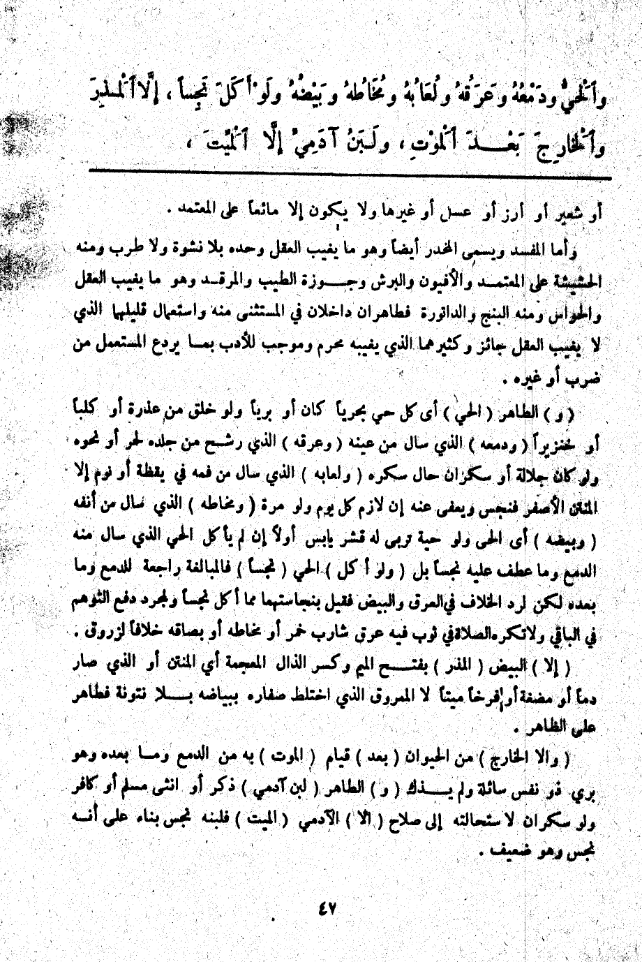(وَإِلَّا الْخَارِجَ) مِنْ الْحَيَوَانِ (بَعْدَ) قِيَامِ (الْمَوْتِ) بِهِ مِنْ الدَّمْعِ وَمَا بَعْدَهُ وَهُوَ بَرِّيٌّ ذُو نَفْسٍ سَائِلَةٍ وَلَمْ يُذَكَّ.
