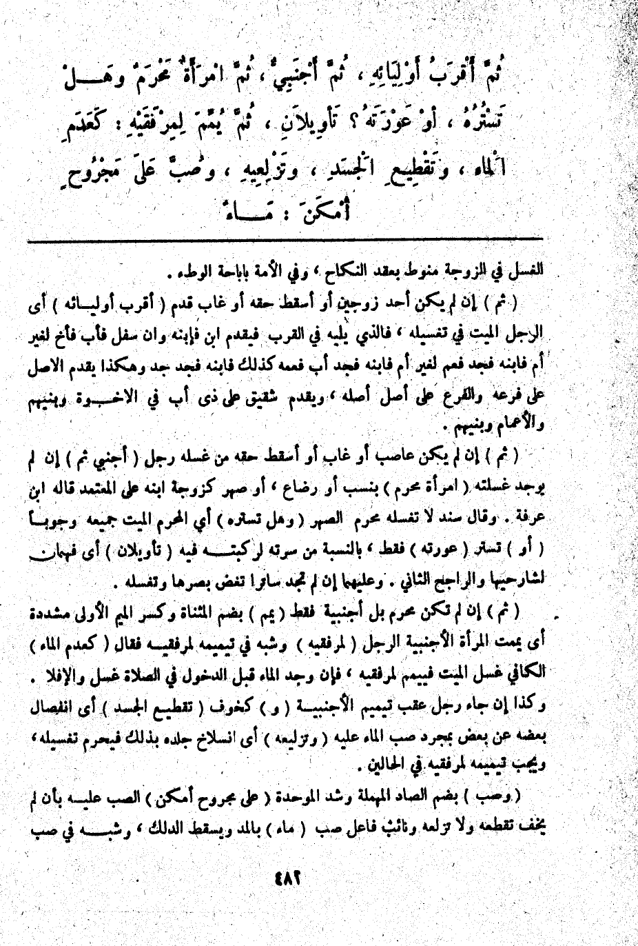 (ثُمَّ) إنْ لَمْ يَكُنْ أَحَدُ زَوْجَيْنِ أَوْ أَسْقَطَ حَقَّهُ أَوْ غَابَ قُدِّمَ (أَقْرَبُ أَوْلِيَائِهِ) أَيْ الرَّجُلِ الْمَيِّتِ فِي تَغْسِيلِهِ، فَاَلَّذِي يَلِيهِ فِي الْقُرْبِ فَيُقَدَّمُ ابْنٌ فَابْنُهُ، وَإِنْ سَفَلَ فَأَبٌ فَأَخٌ لِغَيْرِ أُمٍّ فَابْنُهُ فَجَدٌّ فَعَمٌّ لِغَيْرِ أُمٍّ فَابْنُهُ فَجَدُّ أَبٍ فَعَمُّهُ كَذَلِكَ فَابْنُهُ فَجَدُّ جَدٍّ، وَهَكَذَا يُقَدَّمُ الْأَصْلُ عَلَى فَرْعِهِ وَالْفَرْعُ عَلَى أَصْلِ أَصْلِهِ، وَيُقَدَّمُ شَقِيقٌ عَلَى ذِي أَبٍ فِي الْأُخُوَّةِ وَبَنِيهِمْ وَالْأَعْمَامُ وَبَنِيهِمْ. (ثُمَّ) إنْ لَمْ يَكُنْ عَاصِبٌ أَوْ غَابَ أَوْ أَسْقَطَ حَقَّهُ مِنْ غُسْلِهِ رَجُلٌ (أَجْنَبِيٌّ) .