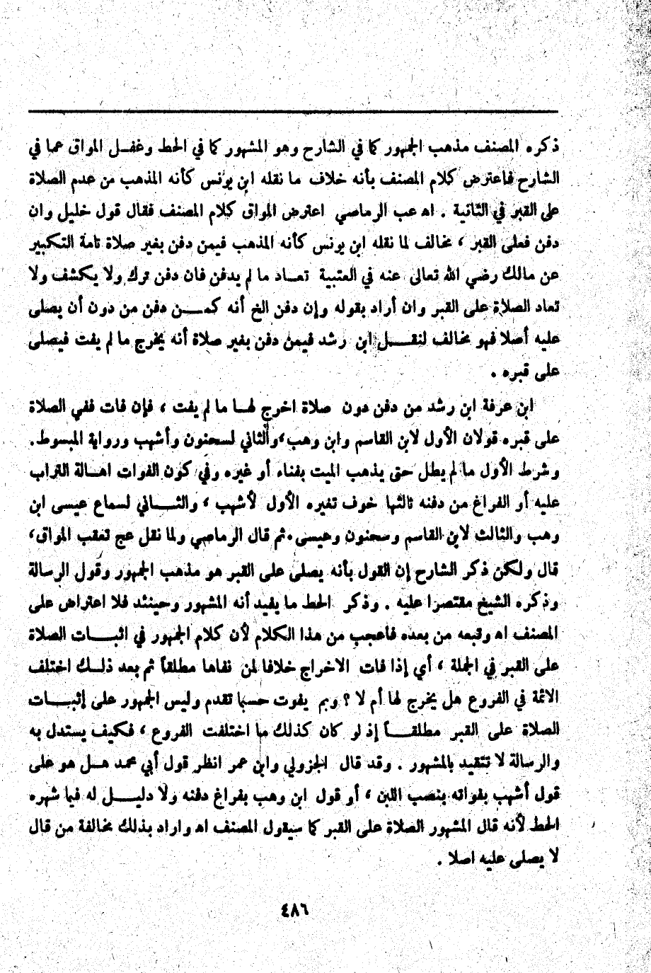 ابْنُ عَرَفَةَ ابْنُ رُشْدٍ مَنْ دُفِنَ دُونَ صَلَاةٍ أُخْرِجَ لَهَا مَا لَمْ يَفُتْ، فَإِنْ فَاتَ فَفِي الصَّلَاةِ عَلَى قَبْرِهِ قَوْلَانِ الْأَوَّلُ لِابْنِ الْقَاسِمِ وَابْنِ وَهْبٍ، وَالثَّانِي لِسَحْنُونٍ وَأَشْهَبَ وَرِوَايَةِ الْمَبْسُوطِ. وَشَرْطُ الْأَوَّلِ مَا لَمْ يَطُلْ حَتَّى يَذْهَبَ الْمَيِّتُ بِفِنَاءٍ أَوْ غَيْرِهِ وَفِي كَوْنِ الْفَوَاتِ إهَالَةَ التُّرَابِ عَلَيْهِ أَوْ الْفَرَاغَ مِنْ دَفْنِهِ ثَالِثُهَا خَوْفُ تَغَيُّرِهِ الْأَوَّلُ لِأَشْهَبَ، وَالثَّانِي لِسَمَاعِ عِيسَى بْنِ وَهْبٍ وَالثَّالِثُ لِابْنِ الْقَاسِمِ وَسَحْنُونٍ وَعِيسَى. ثُمَّ قَالَ الرَّمَاصِيُّ وَلَمَّا نَقَلَ عج تَعَقَّبَ الْمَوَّاقُ، قَالَ وَلَكِنْ ذَكَرَ الشَّارِحُ أَنَّ الْقَوْلَ بِأَنَّهُ يُصَلَّى عَلَى الْقَبْرِ هُوَ مَذْهَبُ الْجُمْهُورِ وَقَوْلُ الرِّسَالَةِ وَذَكَرَهُ الشَّيْخُ مُقْتَصِرًا عَلَيْهِ. وَذَكَرَ الْحَطّ مَا يُفِيدُ أَنَّهُ الْمَشْهُورُ وَحِينَئِذٍ فَلَا اعْتِرَاضَ عَلَى الْمُصَنِّفِ اهـ وَتَبِعَهُ مَنْ بَعْدَهُ فَاعْجَبْ مِنْ هَذَا الْكَلَامِ لِأَنَّ كَلَامَ الْجُمْهُورِ فِي إثْبَاتِ الصَّلَاةِ عَلَى الْقَبْرِ فِي الْجُمْلَةِ، أَيْ إذَا فَاتَ الْإِخْرَاجُ خِلَافًا لِمَنْ نَفَاهَا مُطْلَقًا ثُمَّ بَعْدَ ذَلِكَ اخْتَلَفَ الْأَئِمَّةُ فِي الْفُرُوعِ هَلْ يُخْرَجُ لَهَا أَمْ لَا؟ وَبِمَ يَفُوتُ حَسْبَمَا تَقَدَّمَ وَلَيْسَ الْجُمْهُورُ عَلَى إثْبَاتِ الصَّلَاةِ عَلَى الْقَبْرِ مُطْلَقًا إذْ لَوْ كَانَ كَذَلِكَ مَا اخْتَلَفَتْ الْفُرُوعُ، فَكَيْفَ يُسْتَدَلُّ بِهِ وَالرِّسَالَةُ لَا تَتَقَيَّدُ بِالْمَشْهُورِ. وَقَدْ قَالَ الْجُزُولِيُّ وَابْنُ عُمَرَ اُنْظُرْ قَوْلَ أَبِي مُحَمَّدٍ هَلْ هُوَ عَلَى قَوْلِ أَشْهَبَ بِفَوَاتِهِ بِنَصْبِ اللَّبِنِ، أَوْ قَوْلِ ابْنِ وَهْبٍ بِفَرَاغِ دَفْنِهِ وَلَا دَلِيلَ لَهُ فِيمَا شَهَّرَهُ الْحَطّ؛ لِأَنَّهُ قَالَ الْمَشْهُورُ الصَّلَاةُ عَلَى الْقَبْرِ كَمَا سَيَقُولُ الْمُصَنِّفُ اهـ. وَأَرَادَ بِذَلِكَ مُخَالَفَةَ مَنْ قَالَ لَا يُصَلَّى عَلَيْهِ أَصْلًا.