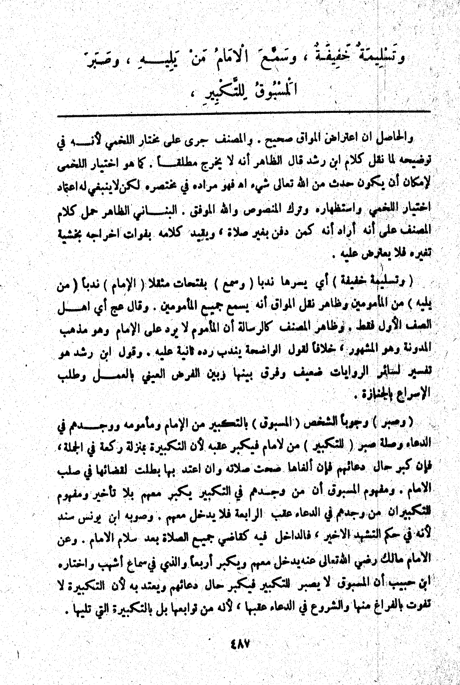 (وَسَمَّعَ) بِفَتَحَاتٍ مُثَقَّلًا (الْإِمَامُ) نَدْبًا (مَنْ يَلِيهِ) مِنْ الْمَأْمُومِينَ وَظَاهِرُ نَقْلِ الْمَوَّاقِ أَنَّهُ يُسْمِعُ جَمِيعَ الْمَأْمُومِينَ. وَقَالَ عج أَيْ أَهْلَ الصَّفِّ الْأَوَّلِ فَقَطْ. وَظَاهِرُ الْمُصَنِّفِ كَالرِّسَالَةِ أَنَّ الْمَأْمُومَ لَا يَرُدُّ عَلَى الْإِمَامِ، وَهُوَ مَذْهَبُ الْمُدَوَّنَةِ، وَهُوَ الْمَشْهُورُ، خِلَافًا لِقَوْلِ الْوَاضِحَةِ يُنْدَبُ رَدُّهُ ثَانِيَةً عَلَيْهِ. وَقَوْلُ ابْنِ رُشْدٍ هُوَ تَفْسِيرٌ لِسَائِرِ الرِّوَايَاتِ ضَعِيفٌ وَفُرِّقَ بَيْنَهَا وَبَيْنَ الْفَرْضِ الْعَيْنِيِّ بِالْعَمَلِ وَطَلَبِ الْإِسْرَاعِ بِالْجِنَازَةِ.
