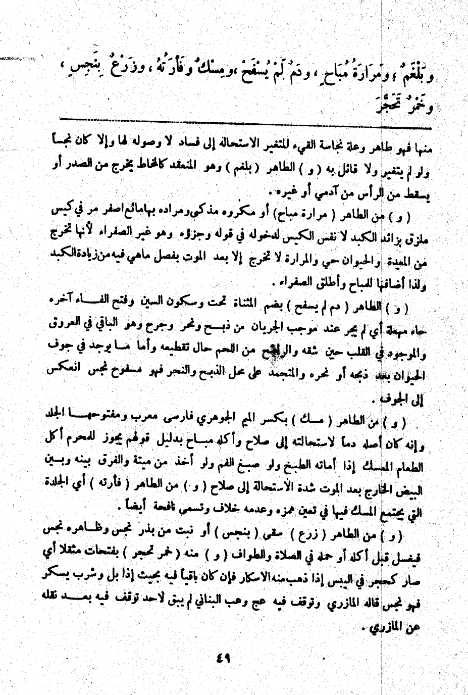 وَبَلْغَمٌ؛ وَمَرَارَةُ مُبَاحٍ، وَدَمٌ لَمْ يُسْفَحْ، وَمِسْكٌ وَفَأْرَتُهُ، وَزَرْعٌ بِنَجِسٍ، وَخَمْرٌ تَحَجَّرَ