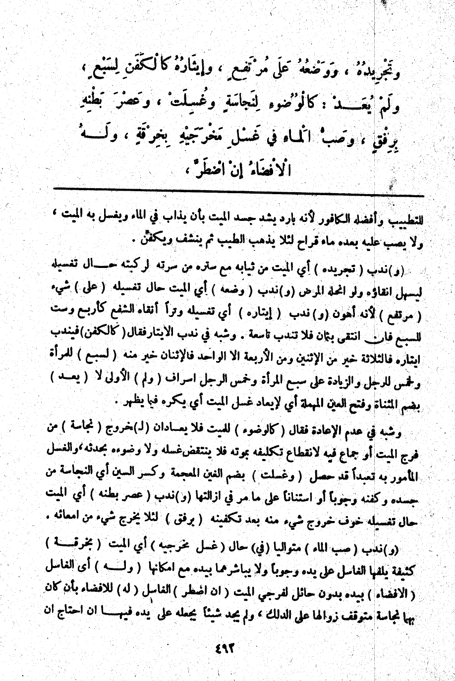 (وَ) نُدِبَ (تَجْرِيدُهُ) أَيْ الْمَيِّتِ مِنْ ثِيَابِهِ مَعَ سَتْرِهِ مِنْ سُرَّتِهِ لِرُكْبَتِهِ حَالَ تَغْسِيلِهِ لِيَسْهُلَ إنْقَاؤُهُ وَلَوْ أَنْحَلَهُ الْمَرَضُ (وَ) نُدِبَ (وَضْعُهُ) أَيْ الْمَيِّتِ حَالَ تَغْسِيلِهِ (عَلَى) شَيْءٍ (مُرْتَفِعٍ) ؛ لِأَنَّهُ أَهْوَنُ (وَ) نُدِبَ (إيتَارُهُ) أَيْ تَغْسِيلُهُ وِتْرًا أَنْقَاهُ الشَّفْعُ كَأَرْبَعٍ وَسِتٍّ لِلسَّبْعِ فَإِنْ انْتَقَى بِثَمَانٍ فَلَا تُنْدَبُ تَاسِعَةٌ. وَشَبَّهَ فِي نَدْبِ الْإِيتَارِ فَقَالَ (كَالْكَفَنِ) فَيُنْدَبُ إيتَارُهُ فَالثَّلَاثَةُ خَيْرٌ مِنْ الِاثْنَيْنِ وَمِنْ الْأَرْبَعَةِ إلَّا الْوَاحِدَ فَالِاثْنَانِ خَيْرٌ مِنْهُ (لِسَبْعٍ) لِلْمَرْأَةِ وَلِخَمْسٍ لِلرَّجُلِ وَالزِّيَادَةُ عَلَى سَبْعٍ لِلْمَرْأَةِ وَخَمْس الرَّجُلِ إسْرَافٌ (وَلَمْ) الْأَوْلَى لَا (يُعَدْ) بِضَمِّ الْمُثَنَّاةِ وَفَتْحِ الْعَيْنِ الْمُهْمَلَةِ أَيْ لِإِيعَادِ غُسْلِ الْمَيِّتِ أَيْ يُكْرَهُ فِيمَا يَظْهَرُ.
