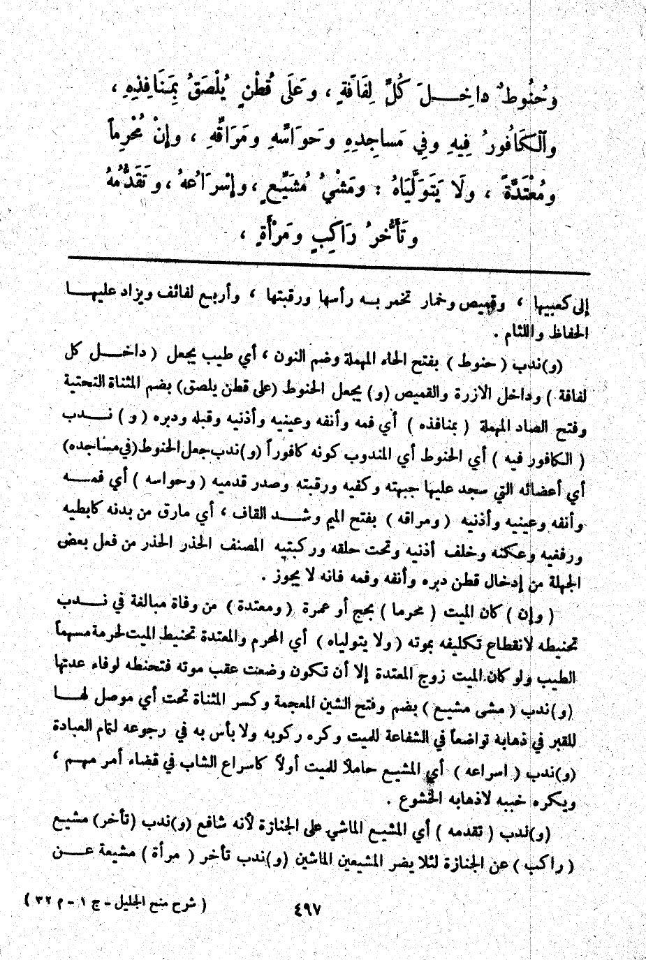 (وَ) نُدِبَ (حَنُوطٌ) بِفَتْحِ الْحَاءِ الْمُهْمَلَةِ وَضَمِّ النُّونِ، أَيْ طِيبٌ يُجْعَلُ (دَاخِلَ كُلِّ لِفَافَةٍ) وَدَاخِلَ الْأُزْرَةِ وَالْقَمِيصِ (وَ) يُجْعَلُ الْحَنُوطُ (عَلَى قُطْنٍ يُلْصَقُ) بِضَمِّ الْمُثَنَّاةِ التَّحْتِيَّةِ وَفَتْحِ الصَّادِ الْمُهْمَلَةِ (بِمَنَافِذِهِ) أَيْ فَمِهِ، وَأَنْفِهِ وَعَيْنَيْهِ وَأُذُنَيْهِ، وَقُبُلِهِ وَدُبُرِهِ (وَ) نُدِبَ (الْكَافُورُ فِيهِ) أَيْ الْحَنُوطِ أَيْ الْمَنْدُوبُ كَوْنُهُ كَافُورًا (وَ) نُدِبَ جَعْلُ الْحَنُوطِ (فِي مَسَاجِدِهِ) أَيْ أَعْضَائِهِ الَّتِي سَجَدَ عَلَيْهَا جَبْهَتِهِ، وَكَفَّيْهِ وَرَقَبَتِهِ وَصَدْرِ قَدَمَيْهِ (وَحَوَاسِّهِ) أَيْ فَمِهِ، وَأَنْفِهِ وَعَيْنَيْهِ وَأُذُنَيْهِ (وَمَرَاقِّهِ) بِفَتْحِ الْمِيمِ وَشَدِّ الْقَافِ، أَيْ مَا رَقَّ مِنْ بَدَنِهِ كَإِبْطَيْهِ وَرَفْغَيْهِ وَعُكَنِهِ وَخَلْفَ أُذُنَيْهِ وَتَحْتَ حَلْقِهِ وَرُكْبَتَيْهِ الْمُصَنِّفُ الْحَذَرُ الْحَذَرُ مِنْ فِعْلِ بَعْضِ الْجَهَلَةِ مِنْ إدْخَالِ قُطْنٍ دُبُرَهُ، وَأَنْفَهُ وَفَمَهُ فَإِنَّهُ لَا يَجُوزُ.
