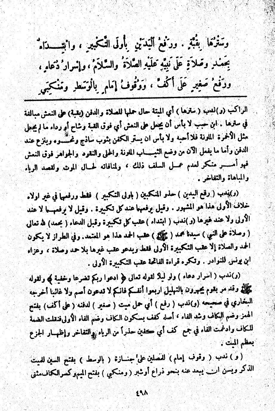 (وَ) نُدِبَ (سَتْرُهَا) أَيْ الْمَيِّتَةِ حَالَ حَمْلِهَا لِلصَّلَاةِ وَالدَّفْنِ (بِقُبَّةٍ) عَلَى النَّعْشِ مُبَالَغَةً فِي سَتْرِهَا. ابْنُ حَبِيبٍ لَا بَأْسَ أَنْ يُجْعَلَ عَلَى النَّعْشِ أَيْ فَوْقَ الْقُبَّةِ وِشَاحٌ أَوْ رِدَاءٌ مَا لَمْ يُجْعَلْ مِثْلُ الْأَخْمِرَةِ الْمُلَوَّنَةِ فَلَا أُحِبُّهُ وَلَا بَأْسَ أَنْ يُسْتَرَ الْكَفَنُ بِثَوْبٍ سَاذَجٍ وَنَحْوِهِ وَيُنْزَعُ عِنْدَ الدَّفْنِ، وَأَمَّا مَا يُفْعَلُ الْآنَ مِنْ وَضْعِ الثِّيَابِ الْمُلَوَّنَةِ وَالْحُلِيِّ وَالنُّقُودِ وَالْجَوَاهِرِ فَوْقَ النَّعْشِ فَهُوَ أَمْرٌ مُنْكَرٌ لِعَدَمِ عَمَلِ السَّلَفِ ذَلِكَ، وَلِمُنَافَاتِهِ لِحَالِ الْمَوْتِ وَلِقَصْدِ الرِّيَاءِ وَالْمُبَاهَاةِ وَالتَّفَاخُرِ.