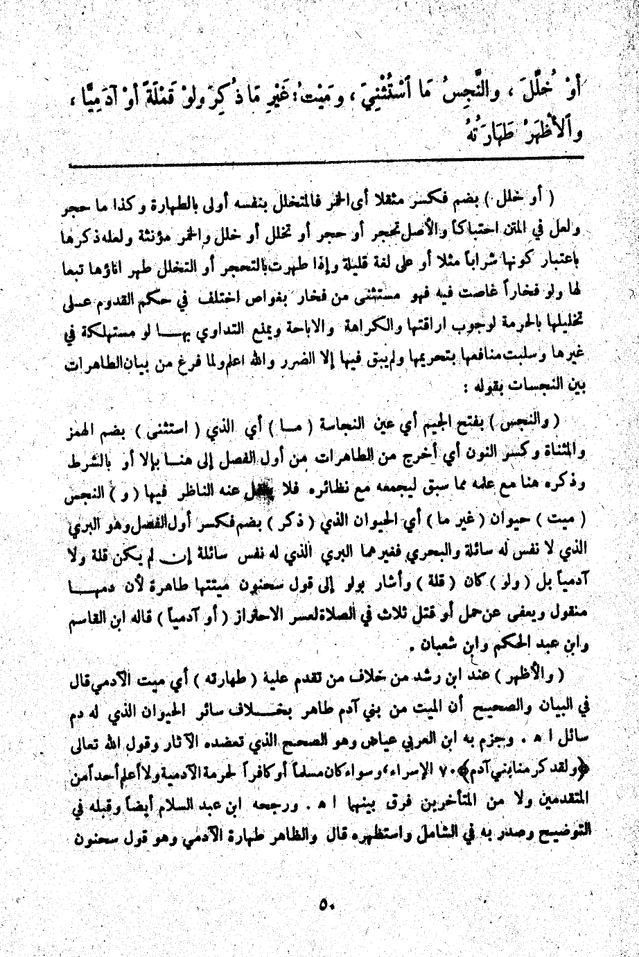 (وَالْأَظْهَرُ) عِنْدَ ابْنِ رُشْدٍ مِنْ خِلَافِ مَنْ تَقَدَّمَ عَلَيْهِ (طَهَارَتُهُ) أَيْ مَيِّتِ الْآدَمِيِّ قَالَ فِي الْبَيَانِ: وَالصَّحِيحُ أَنَّ الْمَيِّتَ مِنْ بَنِي آدَمَ طَاهِرٌ بِخِلَافِ سَائِرِ الْحَيَوَانِ الَّذِي لَهُ دَمٌ سَائِلٌ اهـ. وَجَزَمَ بِهِ ابْنُ الْعَرَبِيِّ عِيَاضٌ وَهُوَ الصَّحِيحُ الَّذِي تُعَضِّدُهُ الْآثَارُ وَقَوْلُ اللَّهِ تَعَالَى {وَلَقَدْ كَرَّمْنَا بَنِي آدَمَ} [الإسراء: 70] وَسَوَاءٌ كَانَ مُسْلِمًا، أَوْ كَافِرًا لِحُرْمَةِ الْآدَمِيَّةِ وَلَا أَعْلَمُ أَحَدًا مِنْ الْمُتَقَدِّمِينَ وَلَا مِنْ الْمُتَأَخِّرِينَ فَرَّقَ بَيْنَهُمَا اهـ. وَرَجَّحَهُ ابْنُ عَبْدِ السَّلَامِ أَيْضًا وَقَبِلَهُ فِي التَّوْضِيحِ وَصَدَّرَ بِهِ فِي الشَّامِلِ وَاسْتَظْهَرَهُ قَالَ وَالظَّاهِرُ طَهَارَةُ الْآدَمِيِّ وَهُوَ قَوْلُ سَحْنُونٍ