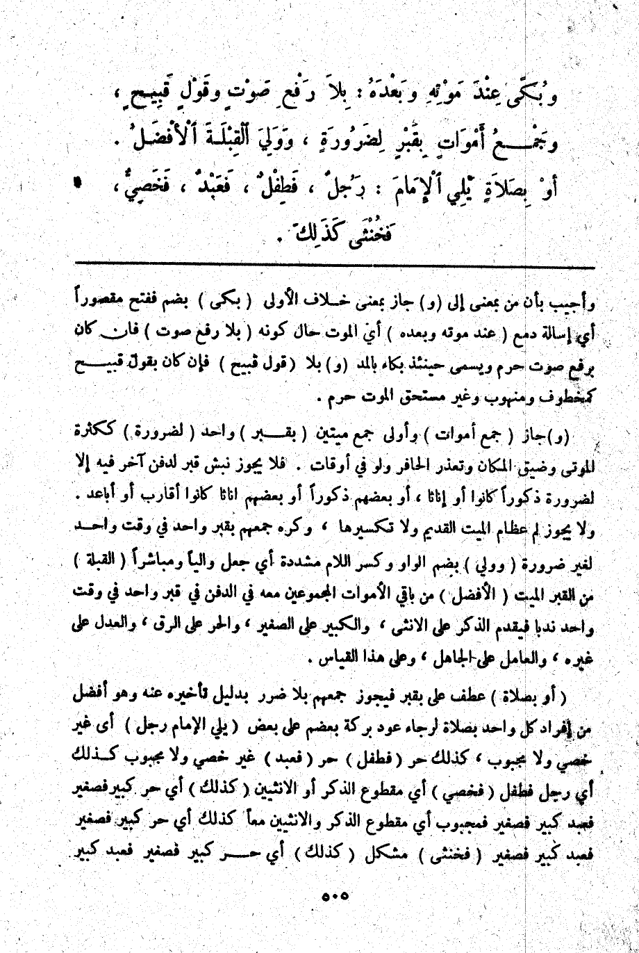 (وَ) جَازَ بِمَعْنَى خِلَافِ الْأَوْلَى (بُكًى) بِضَمٍّ فَفَتْحٍ مَقْصُورًا أَيْ إسَالَةُ دَمْعٍ (عِنْدَ مَوْتِهِ وَبَعْدَهُ) أَيْ الْمَوْتِ حَالَ كَوْنِهِ (بِلَا رَفْعِ صَوْتٍ) فَإِنْ كَانَ بِرَفْعِ صَوْتٍ حَرُمَ وَيُسَمَّى حِينَئِذٍ بُكَاءً بِالْمَدِّ (وَ) بِلَا (قَوْلٍ قَبِيحٍ) فَإِنْ كَانَ بِقَوْلٍ قَبِيحٍ كَمَخْطُوفٍ وَمَنْهُوبٍ وَغَيْرِ مُسْتَحِقِّ الْمَوْتِ حَرُمَ.