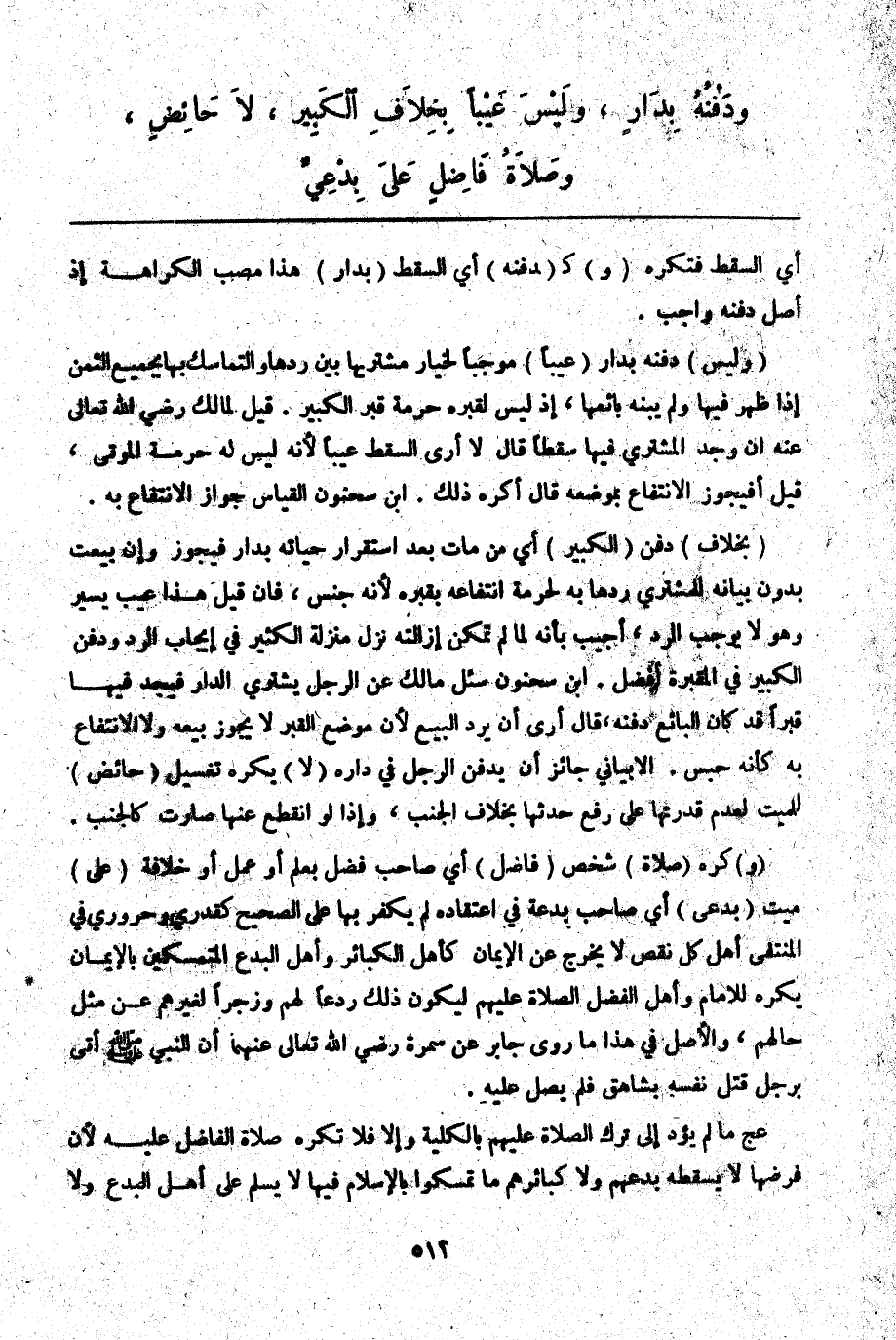(وَ) كُرِهَ (صَلَاةُ) شَخْصٍ (فَاضِلٍ) أَيْ صَاحِبِ فَضْلٍ بِعِلْمٍ أَوْ عَمَلٍ أَوْ خِلَافَةٍ (عَلَى) مَيِّتٍ (بِدْعِيٍّ) أَيْ صَاحِبِ بِدْعَةٍ فِي اعْتِقَادِهِ لَمْ يَكْفُرْ بِهَا عَلَى الصَّحِيحِ كَقَدَرِيٍّ وَحَرُورِيٍّ فِي الْمُنْتَقَى: أَهْلُ كُلِّ نَقْصٍ لَا يَخْرُجُ عَنْ الْإِيمَانِ كَأَهْلِ الْكَبَائِرِ وَأَهْلِ الْبِدَعِ الْمُتَمَسِّكِينَ بِالْإِيمَانِ يُكْرَهُ لِلْإِمَامِ، وَأَهْلِ الْفَضْلِ الصَّلَاةُ عَلَيْهِمْ لِيَكُونَ ذَلِكَ رَدْعًا لَهُمْ وَزَجْرًا لِغَيْرِهِمْ عَنْ مِثْلِ حَالِهِمْ، وَالْأَصْلُ فِي هَذَا مَا رَوَى جَابِرٌ عَنْ سَمُرَةَ - رَضِيَ اللَّهُ تَعَالَى عَنْهُمَا - «أَنَّ النَّبِيَّ - صَلَّى اللَّهُ عَلَيْهِ وَسَلَّمَ - أُتِيَ بِرَجُلٍ قَتَلَ نَفْسَهُ بِشَاهِقٍ فَلَمْ يُصَلِّ عَلَيْهِ» . عج مَا لَمْ يُؤَدِّ إلَى تَرْكِ الصَّلَاةِ عَلَيْهِمْ بِالْكُلِّيَّةِ، وَإِلَّا فَلَا تُكْرَهُ صَلَاةُ الْفَاضِلِ عَلَيْهِ؛ لِأَنَّ فَرْضَهَا لَا يُسْقِطُهُ بِدَعُهُمْ وَلَا كَبَائِرُهُمْ مَا تَمَسَّكُوا بِالْإِسْلَامِ فِيهَا لَا يُسَلَّمُ عَلَى أَهْلِ الْبِدَعِ وَلَا