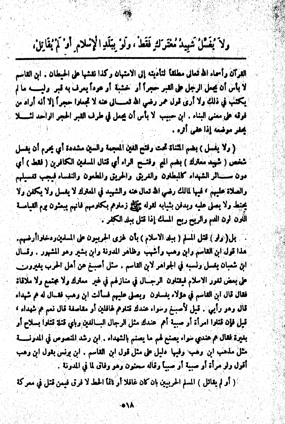 (وَلَا يُغَسَّلُ) بِضَمِّ الْمُثَنَّاةِ تَحْتُ وَفَتْحِ الْغَيْنِ الْمُعْجَمَةِ وَالسِّينِ مُشَدَّدَةً أَيْ يَحْرُمُ أَنْ يُغَسَّلَ شَخْصٌ (شَهِيدُ مُعْتَرَكٍ) بِضَمِّ الْمِيمِ وَفَتْحِ الرَّاءِ أَيْ قِتَالِ الْمُسْلِمِينَ الْكَافِرِينَ (فَقَطْ) أَيْ دُونَ سَائِرِ الشُّهَدَاءِ كَالْمَبْطُونِ وَالْغَرِيقِ وَالْحَرِيقِ وَالْمَطْعُونِ وَالنُّفَسَاءِ فَيَجِبُ تَغْسِيلُهُمْ وَالصَّلَاةُ عَلَيْهِمْ، فِيهَا لِمَالِكٍ - رَضِيَ اللَّهُ تَعَالَى عَنْهُ - وَالشَّهِيدُ فِي الْمُعْتَرَكِ لَا يُغَسَّلُ وَلَا يُكَفَّنُ وَلَا يُحَنَّطُ وَلَا يُصَلَّى عَلَيْهِ وَيُدْفَنُ بِثِيَابِهِ لِقَوْلِهِ - صَلَّى اللَّهُ عَلَيْهِ وَسَلَّمَ - «زَمِّلُوهُمْ بِكُلُومِهِمْ فَإِنَّهُمْ يُبْعَثُونَ يَوْمَ الْقِيَامَةِ اللَّوْنُ لَوْنُ الدَّمِ وَالرِّيحُ رِيحُ الْمِسْكِ إذَا قُتِلَ بِبَلَدِ الْكُفْرِ.» بَلْ (وَلَوْ) قُتِلَ الْمُسْلِمُ (بِبَلَدِ الْإِسْلَامِ) بِأَنْ غَزَا الْحَرْبِيُّونَ عَلَى الْمُسْلِمِينَ وَدَخَلُوا أَرْضَهُمْ. هَذَا قَوْلُ ابْنِ الْقَاسِمِ وَابْنِ وَهْبٍ وَأَشْهَبَ وَظَاهِرُ الْمُدَوَّنَةِ وَابْنِ بَشِيرٍ، وَهُوَ الْمَشْهُورُ. وَقَالَ ابْنُ شَعْبَانَ يُغَسَّلُ وَنَسَبَهُ فِي الْجَوَاهِرِ لِابْنِ الْقَاسِمِ. سُئِلَ أَصْبَغُ عَنْ أَهْلِ الْحَرْبِ يُغِيرُونَ عَلَى بَعْضِ ثُغُورِ الْإِسْلَامِ فَيَقْتُلُونَ الرِّجَالَ فِي مَنَازِلِهِمْ فِي غَيْرِ مُعْتَرَكٍ وَلَا مُجْتَمَعٍ وَلَا مُلَاقَاةٍ فَقَالَ قَالَ ابْنُ الْقَاسِمِ فِي هَؤُلَاءِ يُغَسَّلُونَ وَيُصَلَّى عَلَيْهِمْ فَسَأَلْت ابْنَ وَهْبٍ فَقَالَ لَهُ هُمْ شُهَدَاءُ قَالَ، وَهُوَ رَأْيِي. قِيلَ لِأَصْبَغَ وَسَوَاءٌ عِنْدَك قَتَلُوهُمْ غَافِلِينَ أَوْ مُقَاصَفَةً قَالَا نَعَمْ هُمْ شُهَدَاءُ، قِيلَ فَإِنْ قَتَلُوا امْرَأَةً أَوْ صَبِيَّةً أَهُمْ عِنْدَك مِثْلُ الرِّجَالِ الْبَالِغِينَ وَبِأَيِّ قِتْلَةٍ قُتِلُوا بِسِلَاحٍ أَوْ بِغَيْرِهِ فَقَالَ هُمْ عِنْدِي سَوَاءٌ يُصْنَعُ لَهُمْ مَا يُصْنَعُ بِالشُّهَدَاءِ. ابْنُ رُشْدٍ الْمَنْصُوصُ فِي الْمُدَوَّنَةِ مِثْلُ مَذْهَبِ ابْنِ وَهْبٍ وَفِيهَا دَلِيلٌ عَلَى مِثْلِ قَوْلِ ابْنِ الْقَاسِمِ. ابْنُ يُونُسَ بِقَوْلِ ابْنِ وَهْبٍ أَقُولُ وَلَوْ مَرْأَةً أَوْ صَبِيَّةً أَوْ صَبِيًّا، وَقَالَهُ سَحْنُونٌ، وَهُوَ وِفَاقٌ لِمَا فِي الْمُدَوَّنَةِ.