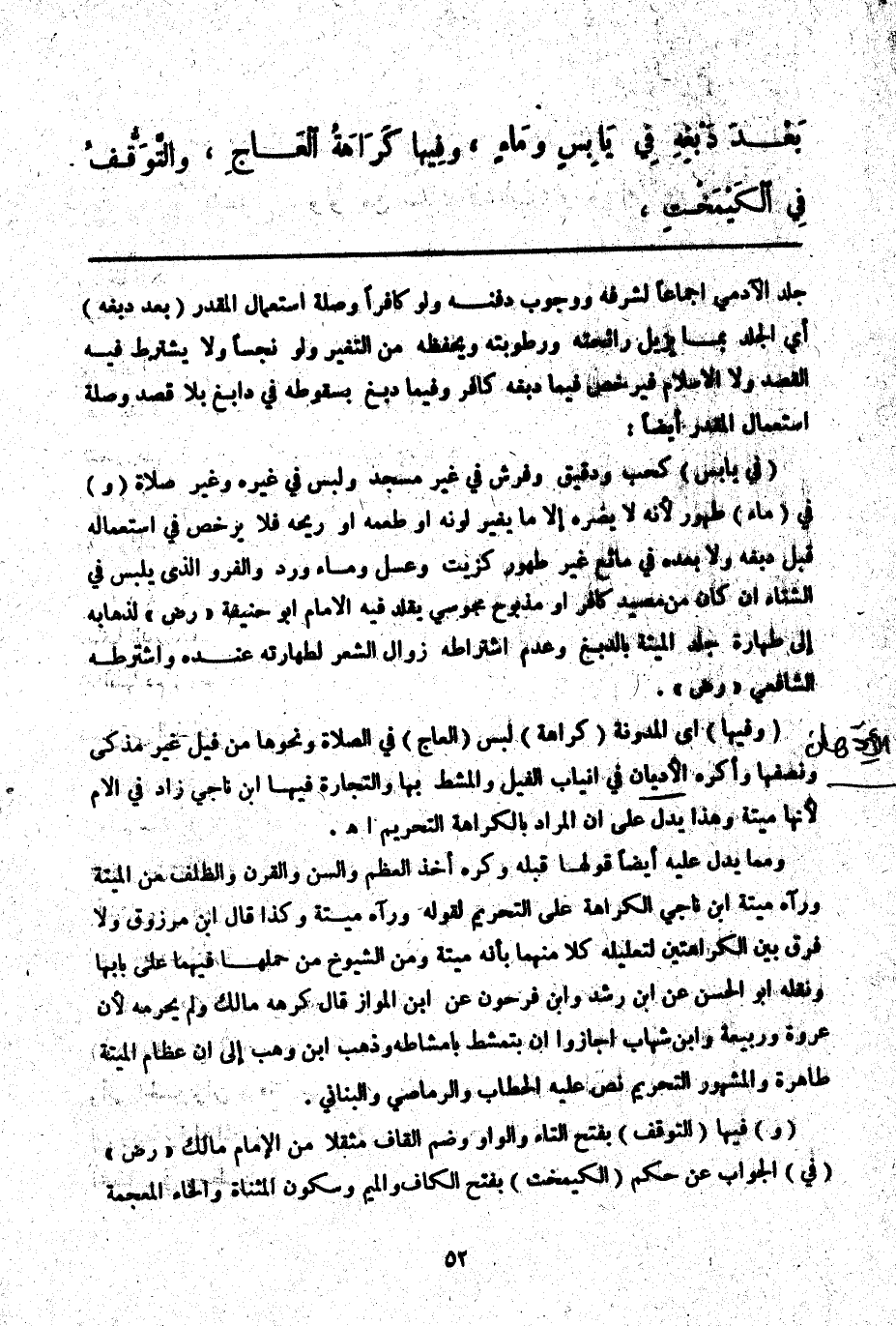 (وَفِيهَا) أَيْ الْمُدَوَّنَةِ (كَرَاهَةُ) لُبْسِ (الْعَاجِ) فِي الصَّلَاةِ وَنَحْوَهَا مِنْ فِيلٍ غَيْرِ مُذَكًّى وَنِصْفِهَا وَأَكْرَهُ الْأَدْيَانِ فِي أَنْيَابِ الْفِيلِ، وَالْمَشْطِ بِهَا وَالتِّجَارَةِ فِيهَا ابْنُ نَاجِي زَادَ فِي الْأُمِّ؛ لِأَنَّهَا مَيْتَةٌ وَهَذَا يَدُلُّ عَلَى أَنَّ الْمُرَادَ بِالْكَرَاهَةِ التَّحْرِيمُ اهـ. وَمِمَّا يَدُلُّ عَلَيْهِ أَيْضًا قَوْلُهَا قَبْلَهُ وَكُرِهَ أَخْذُ الْعَظْمِ وَالسِّنِّ، وَالْقَرْنِ وَالظِّلْفِ مِنْ الْمَيْتَةِ وَرَآهُ مَيْتَةً ابْنُ نَاجِي: الْكَرَاهَةُ عَلَى التَّحْرِيمِ لِقَوْلِهِ وَرَآهُ مَيْتَةً وَكَذَا قَالَ ابْنُ مَرْزُوقٍ وَلَا فَرْقَ بَيْنَ الْكَرَاهَتَيْنِ لِتَعْلِيلِهِ كُلًّا مِنْهُمَا بِأَنَّهُ مَيْتَةٌ وَمِنْ الشُّيُوخِ مَنْ حَمَلَهَا فِيهِمَا عَلَى بَابِهَا وَنَقَلَهُ أَبُو الْحَسَنِ عَنْ ابْنِ رُشْدٍ وَابْنُ فَرْحُونٍ عَنْ ابْنِ الْمَوَّازِ قَالَ كَرِهَهُ مَالِكٌ وَلَمْ يُحَرِّمْهُ؛ لِأَنَّ عُرْوَةَ وَرَبِيعَةَ وَابْنَ شِهَابٍ أَجَازُوا أَنْ يُتَمَشَّطَ بِأَمْشَاطِهِ وَذَهَبَ ابْنُ وَهْبٍ إلَى أَنَّ عِظَامَ الْمَيْتَةِ طَاهِرَةٌ، وَالْمَشْهُورُ التَّحْرِيمُ نَصَّ عَلَيْهِ الْحَطَّابُ وَالرَّمَاصِيُّ وَالْبَنَّانِيُّ.