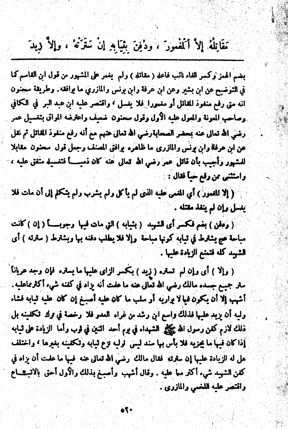 ـــــــــــــــــــــــــــــQبِضَمِّ الْهَمْزِ، وَكَسْرِ الْفَاءِ نَائِبُ فَاعِلِهِ (مَقَاتِلُهُ) وَلَمْ يُغْمَرْ عَلَى الْمَشْهُورِ مِنْ قَوْلِ ابْنِ الْقَاسِمِ كَمَا فِي التَّوْضِيحِ عَنْ ابْنِ بَشِيرٍ وَعَنْ ابْنِ عَرَفَةَ وَابْنِ يُونُسَ وَالْمَازِرِيِّ مَا يُوَافِقُهُ. وَطَرِيقَةُ سَحْنُونٍ أَنَّهُ مَتَى رُفِعَ مَنْفُوذُ الْمَقَاتِلِ أَوْ مَغْمُورًا فَلَا يُغَسَّلُ، وَاقْتَصَرَ عَلَيْهِ ابْنُ عَبْدِ الْبَرِّ فِي الْكَافِي وَصَاحِبُ الْمَعُونَةِ وَالْمُعَوَّلُ عَلَيْهِ الْأَوَّلُ، وَقَوْلُ سَحْنُونٍ ضَعِيفٌ وَاعْتَرَضَهُ الْمَوَّاقُ بِتَغْسِيلِ عُمَرَ - رَضِيَ اللَّهُ تَعَالَى عَنْهُ - بِمَحْضَرِ الصَّحَابَةِ - رَضِيَ اللَّهُ تَعَالَى عَنْهُمْ - مَعَ أَنَّهُ رُفِعَ مَنْفُوذَ الْمَقَاتِلِ ثُمَّ نَقَلَ عَنْ ابْنِ عَرَفَةَ وَابْنِ يُونُسَ وَالْمَازِرِيِّ مَا ظَاهِرُهُ يُوَافِقُ الْمُصَنِّفَ وَجَعَلَ قَوْلَ سَحْنُونٍ مُقَابِلًا لِلْمَشْهُورِ وَأُجِيبَ بِأَنَّ قَاتِلَ عُمَرَ - رَضِيَ اللَّهُ تَعَالَى عَنْهُ - كَانَ ذِمِّيًّا فَتَغْسِيلُهُ مُتَّفَقٌ عَلَيْهِ، وَاسْتَثْنَى مِمَّنْ رُفِعَ حَيًّا فَقَالَ.