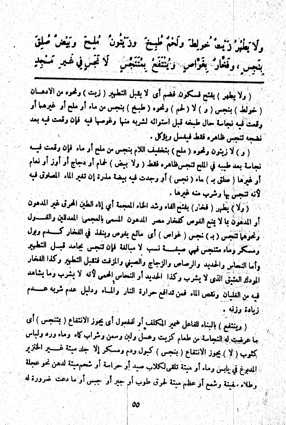 ـــــــــــــــــــــــــــــQوَلَا يَطْهُرُ) بِفَتْحٍ فَسُكُونٍ فَضَمٍّ أَيْ لَا يَقْبَلُ التَّطْهِيرَ (زَيْتٌ) وَنَحْوُهُ مِنْ الْأَدْهَانِ (خُولِطَ) بِنَجَسٍ (وَ) لَا (لَحْمٌ) وَنَحْوُهُ (طُبِخَ) بِنَجِسٍ مِنْ مَاءٍ، أَوْ مِلْحٍ أَوْ غَيْرِهِمَا، أَوْ وَقَعَتْ فِيهِ نَجَاسَةٌ حَالَ طَبْخِهِ قَبْلَ اسْتِوَائِهِ لِشُرْبِهِ مِنْهَا وَغَوْصِهَا فِيهِ فَإِنْ وَقَعَتْ فِيهِ بَعْدَ نُضْجِهِ تَنَجَّسَ ظَاهِرُهُ فَقَطْ فَيُغْسَلُ وَيُؤْكَلُ.