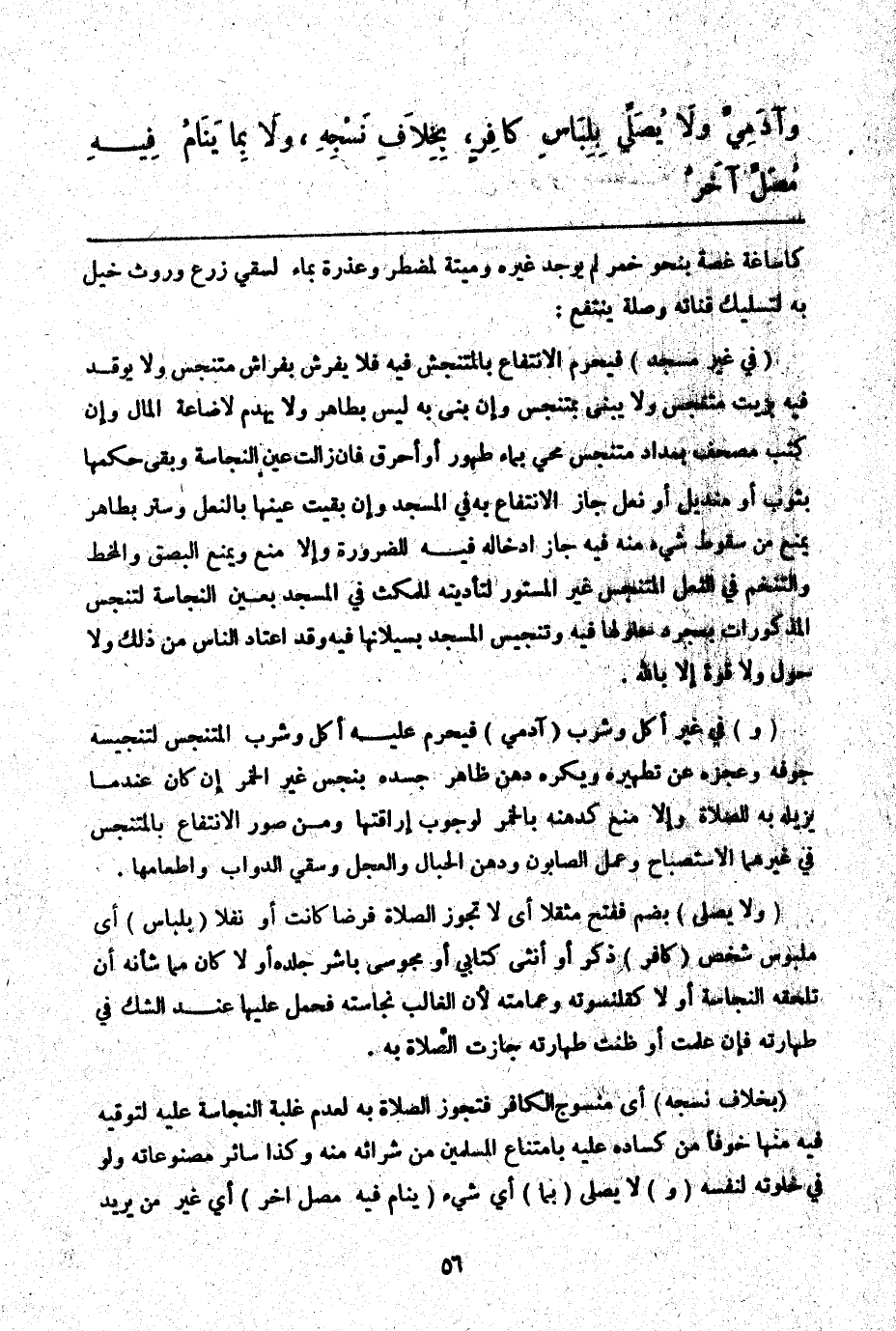 (بِخِلَافِ نَسْجِهِ) أَيْ مَنْسُوجِ الْكَافِرِ فَتَجُوزُ الصَّلَاةُ بِهِ لِعَدَمِ غَلَبَةِ النَّجَاسَةِ عَلَيْهِ لِتَوَقِّيهِ فِيهِ مِنْهَا خَوْفًا مِنْ كَسَادِهِ عَلَيْهِ بِامْتِنَاعِ الْمُسْلِمِينَ مِنْ شِرَائِهِ مِنْهُ وَكَذَا سَائِرُ مَصْنُوعَاتِهِ وَلَوْ فِي خَلْوَتِهِ لِنَفْسِهِ (وَ) لَا يُصَلَّى (بِمَا) أَيْ شَيْءٍ (يَنَامُ فِيهِ مُصَلٍّ آخَرُ) أَيْ غَيْرُ مَنْ يُرِيدُ