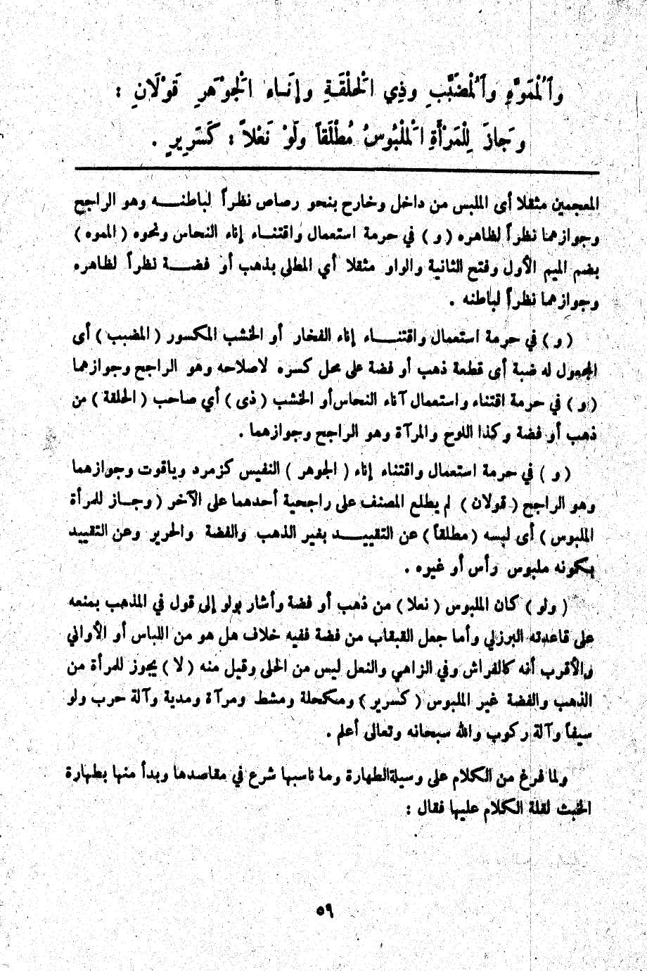 (وَ) فِي حُرْمَةِ اسْتِعْمَالِ وَاقْتِنَاءِ إنَاءِ الْفَخَّارِ أَوْ الْخَشَبِ الْمَكْسُورِ (الْمُضَبَّبِ) أَيْ الْمَجْعُولِ لَهُ ضَبَّةٌ أَيْ قِطْعَةُ ذَهَبٍ، أَوْ فِضَّةٍ عَلَى مَحَلِّ كَسْرِهِ لِإِصْلَاحِهِ وَهُوَ الرَّاجِحُ وَجَوَازِهِمَا.