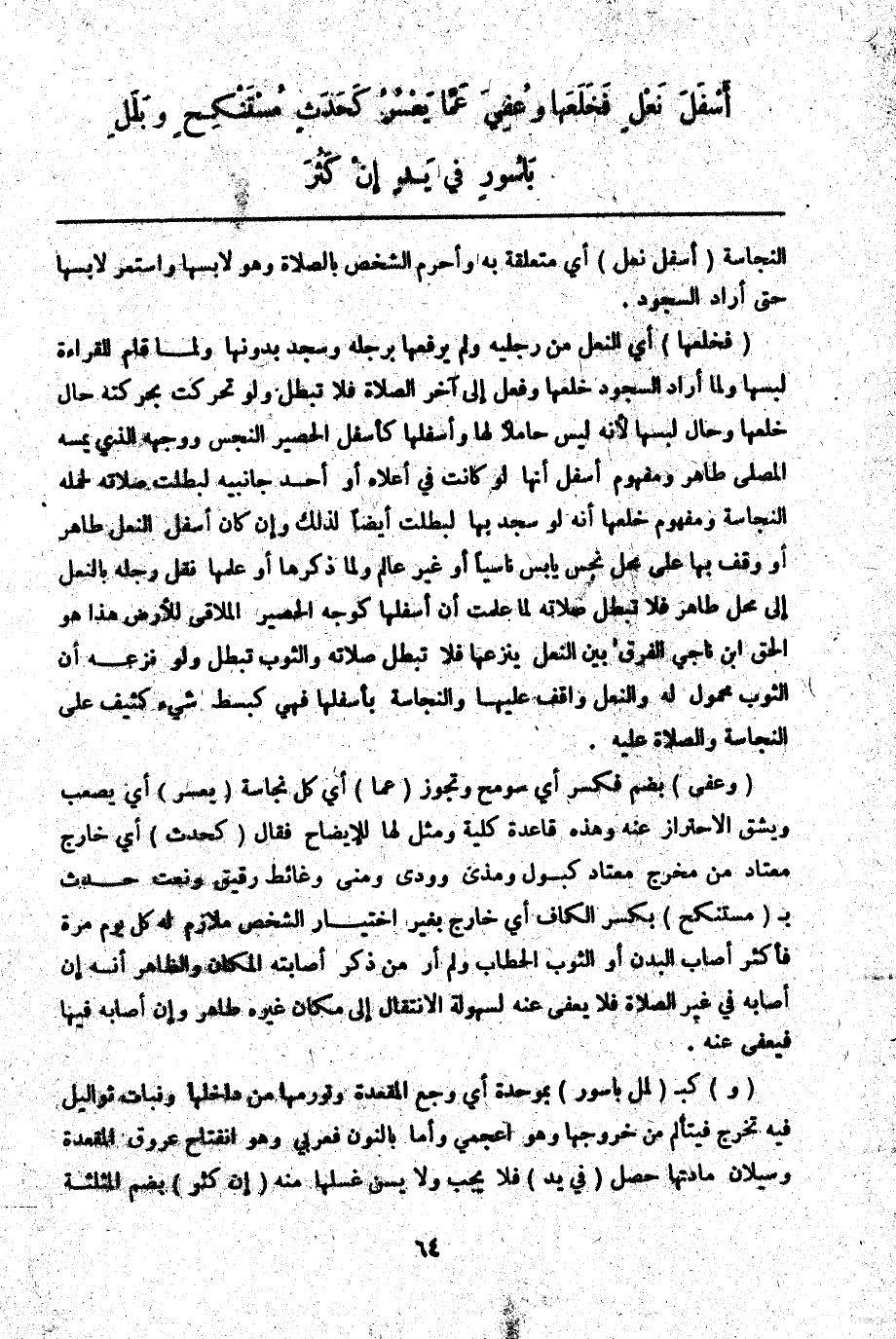 ـــــــــــــــــــــــــــــQالنَّجَاسَةُ (أَسْفَلَ نَعْلٍ) أَيْ مُتَعَلِّقَةً بِهِ وَأَحْرَمَ الشَّخْصُ بِالصَّلَاةِ وَهُوَ لَابِسُهَا وَاسْتَمَرَّ لَابِسَهَا حَتَّى أَرَادَ السُّجُودَ (فَخَلَعَهَا) أَيْ النَّعْلَ مِنْ رِجْلَيْهِ وَلَمْ يَرْفَعْهَا بِرِجْلِهِ وَسَجَدَ بِدُونِهَا وَلَمَّا قَامَ لِلْقِرَاءَةِ لَبِسَهَا وَلَمَّا أَرَادَ السُّجُودَ خَلَعَهَا وَفَعَلَ إلَى آخِرِ الصَّلَاةِ فَلَا تَبْطُلُ وَلَوْ تَحَرَّكَتْ بِحَرَكَتِهِ حَالَ خَلْعِهَا وَحَالَ لُبْسِهَا لِأَنَّهُ لَيْسَ حَامِلًا لَهَا وَأَسْفَلُهَا كَأَسْفَلِ الْحَصِيرِ النَّجِسِ وَوَجْهُهُ الَّذِي يَمَسُّهُ الْمُصَلِّي طَاهِرٌ وَمَفْهُومُ أَسْفَلَ أَنَّهَا لَوْ كَانَتْ فِي أَعْلَاهُ أَوْ أَحَدِ جَانِبَيْهِ لَبَطَلَتْ صَلَاتُهُ لِحَمْلِهِ النَّجَاسَةَ وَمَفْهُومُ خَلْعِهَا أَنَّهُ لَوْ سَجَدَ بِهَا لَبَطَلَتْ أَيْضًا لِذَلِكَ وَإِنْ كَانَ أَسْفَلُ النَّعْلِ طَاهِرًا أَوْ وَقَفَ بِهَا عَلَى مَحَلٍّ نَجِسٍ يَابِسٍ نَاسِيًا أَوْ غَيْرَ عَالِمٍ وَلَمَّا ذَكَرَهَا أَوْ عَلِمَهَا نَقَلَ رِجْلَهُ بِالنَّعْلِ إلَى مَحَلٍّ ظَاهِرٍ فَلَا تَبْطُلُ صَلَاتُهُ لِمَا عَلِمْت أَنَّ أَسْفَلَهَا كَوَجْهِ الْحَصِيرِ الْمُلَاقِي لِلْأَرْضِ هَذَا هُوَ الْحَقُّ ابْنُ نَاجِي الْفَرْقُ بَيْنَ النَّعْلِ يَنْزِعُهَا فَلَا تَبْطُلُ صَلَاتُهُ وَالثَّوْبِ تَبْطُلُ وَلَوْ نَزَعَهُ أَنَّ الثَّوْبَ مَحْمُولٌ لَهُ وَالنَّعْلُ وَاقِفٌ عَلَيْهَا وَالنَّجَاسَةُ بِأَسْفَلِهَا فَهِيَ كَبَسْطِ شَيْءٍ كَثِيفٍ عَلَى النَّجَاسَةِ وَالصَّلَاةِ عَلَيْهِ.