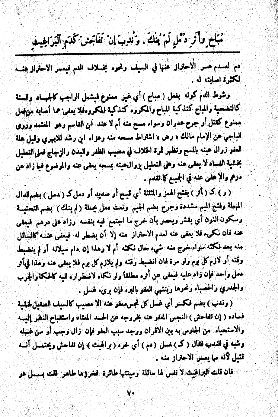 وَشَرْطُ الدَّمِ كَوْنُهُ بِفِعْلٍ (مُبَاحٍ) أَيْ غَيْرَ مَمْنُوعٍ فَيَشْمَلُ الْوَاجِبَ كَالْجِهَادِ وَالسُّنَّةِ كَالتَّضْحِيَةِ وَالْمُبَاحِ كَتَذْكِيَةِ الْمُبَاحِ وَالْمَكْرُوهِ كَتَذْكِيَةِ الْمَكْرُوهِ فَلَا يُعْفَى عَمَّا أَصَابَهُ مِنْ فِعْلٍ مَمْنُوعٍ كَقَتْلٍ أَوْ جَرْحِ عُدْوَانٍ وَسَوَاءٌ مُسِحَ مِنْهُ أَمْ لَا عِنْدَ ابْنِ الْقَاسِمِ وَهُوَ الْمُعْتَمَدُ وَرَوَى الْبَاجِيَّ عَنْ الْإِمَامِ مَالِكٍ " - رَضِيَ اللَّهُ عَنْهُ - " اشْتِرَاطَ مَسْحِهِ مِنْهُ وَعَزَاهُ ابْنُ رُشْدٍ لِلْأَبْهَرِيِّ وَقِيلَ عِلَّةُ الْعَفْوِ زَوَالُ عَيْنِهِ بِالْمَسْحِ وَتَظْهَرُ ثَمَرَةُ الْخِلَافِ فِي مُصِيبِ الظُّفْرِ وَالْبَدَنِ وَالزُّجَاجِ فَعَلَى التَّعْلِيلِ بِخَشْيَةِ الْفَسَادِ لَا يُعْفَى عَنْهُ وَعَلَى التَّعْلِيلِ بِزَوَالِ عَيْنِهِ بِمَسْحِهِ يُعْفَى عَنْهُ وَالْمَوْضُوعُ فِيمَا زَادَ عَنْ دِرْهَمٍ وَإِلَّا عُفِيَ عَنْهُ فِي الْجَمِيعِ كَمَا تَقَدَّمَ.