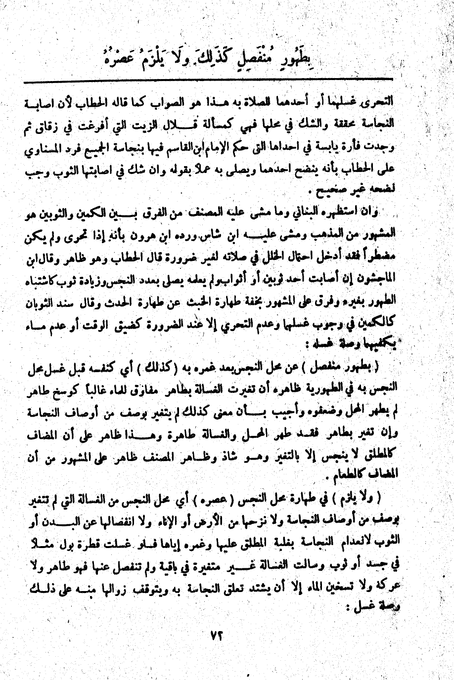 وَإِنْ اسْتَظْهَرَهُ الْبُنَانِيُّ وَمَا مَشَى عَلَيْهِ الْمُصَنِّفُ مِنْ الْفَرْقِ بَيْنَ الْكُمَّيْنِ وَالثَّوْبَيْنِ هُوَ الْمَشْهُورُ مِنْ الْمَذْهَبِ وَمَشَى عَلَيْهِ ابْنُ شَاسٍ وَرَدَّهُ ابْنُ هَارُونَ بِأَنَّهُ إذَا تَحَرَّى وَلَمْ يَكُنْ مُضْطَرًّا فَقَدْ أَدْخَلَ احْتِمَالَ الْخَلَلِ فِي صَلَاتِهِ لِغَيْرِ ضَرُورَةٍ قَالَ الْحَطَّابُ: وَهُوَ ظَاهِرٌ، وَقَالَ ابْنُ الْمَاجِشُونِ إنْ أَصَابَتْ أَحَدَ ثَوْبَيْنِ أَوْ أَثْوَابَ وَلَمْ يَعْلَمْهُ يُصَلِّي بِعَدَدِ النَّجِسِ وَزِيَادَةِ ثَوْبٍ كَاشْتِبَاهِ الطَّهُورِ بِغَيْرِهِ وَفَرَّقَ عَلَى الْمَشْهُورِ بِخِفَّةِ طَهَارَةِ الْخَبَثِ عَنْ طَهَارَةِ الْحَدَثِ وَقَالَ سَنَدٌ: الثَّوْبَانِ كَالْكُمَّيْنِ فِي وُجُوبِ غَسْلِهِمَا وَعَدَمِ التَّحَرِّي إلَّا عِنْدَ الضَّرُورَةِ كَضِيقِ الْوَقْتِ أَوْ عَدَمِ مَاءٍ يَكْفِيهِمَا وَصِلَةُ غَسَلَهُ: (بِطَهُورٍ مُنْفَصِلٍ) عَنْ مَحَلِّ النَّجِسِ بَعْدَ غَمْرِهِ بِهِ (كَذَلِكَ) أَيْ كَنَفْسِهِ قَبْلَ غَسْلِ مَحَلِّ النَّجَسِ بِهِ فِي الطَّهُورِيَّةِ ظَاهِرُهُ إنْ تَغَيَّرَتْ الْغُسَالَةُ بِطَاهِرٍ مُفَارِقٍ لِلْمَاءِ غَالِبًا كَوَسَخٍ طَاهِرٍ لَمْ يَطْهُرْ الْمَحَلُّ وَضَعَّفُوهُ وَأُجِيبَ بِأَنَّ مَعْنَى كَذَلِكَ لَمْ يَتَغَيَّرْ بِوَصْفٍ مِنْ أَوْصَافِ النَّجَاسَةِ وَإِنْ تَغَيَّرَ بِطَاهِرٍ فَقَدْ طَهُرَ الْمَحَلُّ وَالْغُسَالَةُ طَاهِرَةٌ وَهَذَا ظَاهِرٌ عَلَى أَنَّ الْمُضَافَ كَالْمُطْلَقِ لَا يَنْجُسُ إلَّا بِالتَّغَيُّرِ وَهُوَ شَاذٌّ وَظَاهِرُ الْمُصَنِّفِ طَاهِرٌ عَلَى الْمَشْهُورِ مِنْ أَنَّ الْمُضَافَ كَالطَّعَامِ.