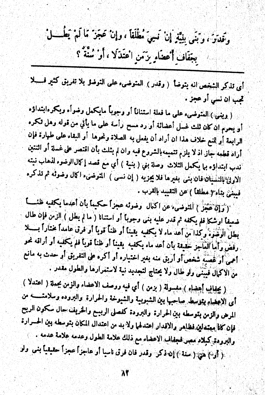 وَقَدَرَ، وَبَنَى بِنِيَّةٍ إنْ نَسِيَ مُطْلَقًا، وَإِنْ عَجَزَ مَا لَمْ يَطُلْ بِجَفَافِ أَعْضَاءٍ بِزَمَنٍ اعْتَدَلَا، أَوْ سُنَّةٌ؟
