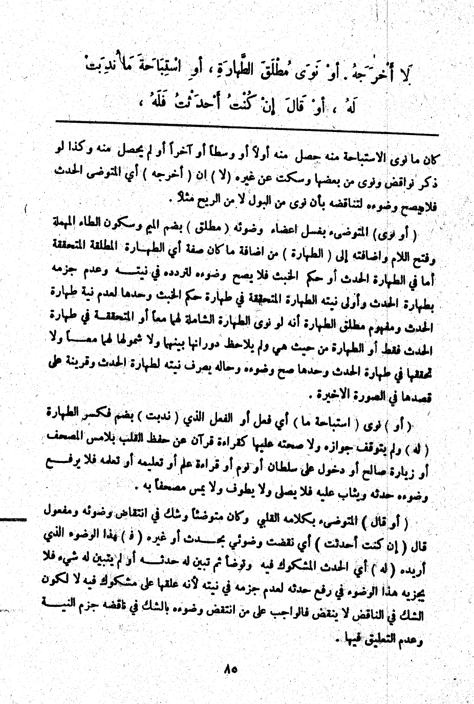 (أَوْ نَوَى) الْمُتَوَضِّئُ بِغَسْلِ أَعْضَاءِ وُضُوئِهِ (مُطْلَقَ) بِضَمِّ الْمِيمِ وَسُكُونِ الطَّاءِ الْمُهْمَلَةِ وَفَتْحِ اللَّامِ وَإِضَافَتِهِ إلَى (الطَّهَارَةِ) مِنْ إضَافَةِ مَا كَانَ صِفَةً أَيْ الطَّهَارَةِ الْمُطْلَقَةِ الْمُتَحَقِّقَةِ أَمَّا فِي طَهَارَةِ الْحَدَثِ أَوْ حُكْمِ الْخَبَثِ فَلَا يَصِحُّ وُضُوءُهُ لِتَرَدُّدِهِ فِي نِيَّتِهِ وَعَدَمِ جَزْمِهِ بِطَهَارَةِ الْحَدَثِ وَأَوْلَى نِيَّتُهُ الطَّهَارَةَ الْمُتَحَقِّقَةَ فِي طَهَارَةِ حُكْمِ الْخَبَثِ وَحْدَهَا لِعَدَمِ نِيَّةِ طَهَارَةِ الْحَدَثِ وَمُفْهِمُ مُطْلَقِ الطَّهَارَةِ أَنَّهُ لَوْ نَوَى الطَّهَارَةَ الشَّامِلَةَ لَهُمَا مَعًا أَوْ الْمُتَحَقِّقَةَ فِي طَهَارَةِ الْحَدَثِ فَقَطْ أَوْ الطَّهَارَةَ مِنْ حَيْثُ هِيَ وَلَمْ يُلَاحَظْ دَوَرَانُهَا بَيْنَهُمَا وَلَا شُمُولُهَا لَهُمَا مَعًا وَلَا تَحَقُّقُهَا فِي طَهَارَةِ الْحَدَثِ وَحْدَهَا صَحَّ وُضُوءُهُ وَحَالُهُ يَصْرِفُ نِيَّتَهُ لِطَهَارَةِ الْحَدَثِ وَقَرِينَةٌ عَلَى قَصْدِهَا فِي الصُّورَةِ الْأَخِيرَةِ.