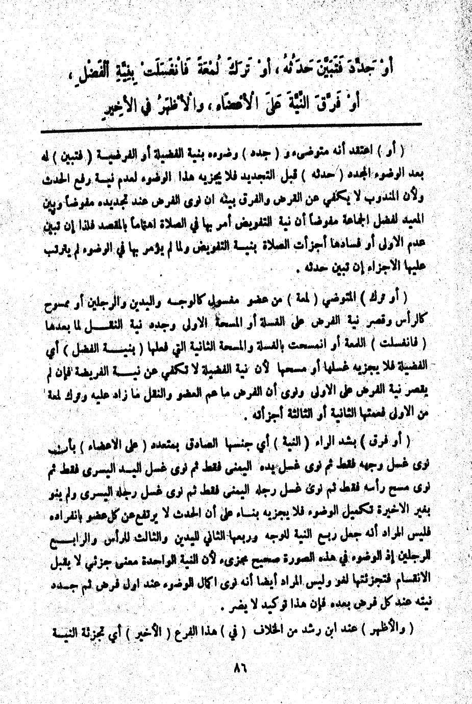 (أَوْ تَرَكَ) الْمُتَوَضِّئُ (لُمْعَةً) مِنْ عُضْوٍ مَغْسُولٍ كَالْوَجْهِ وَالْيَدَيْنِ وَالرِّجْلَيْنِ أَوْ مَمْسُوحٍ كَالرَّأْسِ وَقَصَرَ فِيهِ الْفَرْضَ عَلَى الْغَسْلَةِ أَوْ الْمَسْحَةِ الْأُولَى وَجَدَّدَ نِيَّةَ النَّقْلَ لِمَا بَعْدَهَا (فَانْغَسَلَتْ) اللُّمْعَةُ أَوْ انْمَسَحَتْ بِالْغَسْلَةِ وَالْمَسْحَةِ الثَّانِيَةِ الَّتِي فَعَلَهَا (بِنِيَّةِ الْفَضْلِ) أَيْ الْفَضِيلَةِ فَلَا يَجْزِيهِ غَسْلُهَا أَوْ مَسْحُهَا لِأَنَّ نِيَّةَ الْفَضِيلَةِ لَا تَكْفِي عَنْ نِيَّةِ الْفَرِيضَةِ فَإِنْ لَمْ يَقْصُرْ نِيَّةَ الْفَرْضِ عَلَى الْأُولَى وَنَوَى أَنَّ الْفَرْضَ مَا عَمَّ الْعُضْوَ وَالنَّقْلَ مَا زَادَ عَلَيْهِ وَتَرَكَ لُمْعَةً مِنْ الْأُولَى فَعَمَّتهَا الثَّانِيَةُ أَوْ الثَّالِثَةُ أَجْزَأَتْهُ.