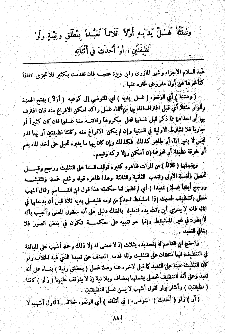 وَيَغْسِلُهُمَا (ثَلَاثًا) مِنْ الْمَرَّاتِ ظَاهِرُهُ كَغَيْرِهِ تَوَقُّفُ السُّنَّةِ عَلَى التَّثْلِيثِ وَرَجَّحَ وَقِيلَ: تَحْصُلُ بِالْغَسْلَةِ الْأُولَى وَتُنْدَبُ الثَّانِيَةُ وَالثَّالِثَةُ وَهَذَا ظَاهِرُهُ قَوْلُهُ: وَشَفَعَ غَسْلَهُ وَتَثْلِيثَهُ وَرَجَّحَ أَيْضًا غَسْلًا (تَعَبُّدًا) أَيْ لَمْ تَظْهَرْ لَنَا حِكْمَتُهُ هَذَا قَوْلُ ابْنِ الْقَاسِمِ وَقَالَ أَشْهَبُ مُعَلِّلًا بِالتَّنْظِيفِ لِحَدِيثِ «إذَا اسْتَيْقَظَ أَحَدُكُمْ مِنْ نَوْمِهِ فَلْيَغْسِلْ يَدَيْهِ ثَلَاثًا قَبْلَ أَنْ يُدْخِلَهُمَا فِي إنَائِهِ فَإِنَّهُ لَا يَدْرِي أَيْنَ بَاتَتْ يَدُهُ» فَتَعْلِيلُهُ بِالشَّكِّ دَلِيلٌ عَلَى أَنَّهُ مَعْقُولُ الْمَعْنَى وَأُجِيبُ بِأَنَّهُ لَا يَطَّرِدُ فِي غَيْرِ الْمُسْتَيْقِظِ وَإِنَّمَا هُوَ تَنْبِيهٌ عَلَى حِكْمَةٍ تَكُونُ فِي بَعْضِ الصُّوَرِ فَلَا يُنَافِي التَّعَبُّدَ.