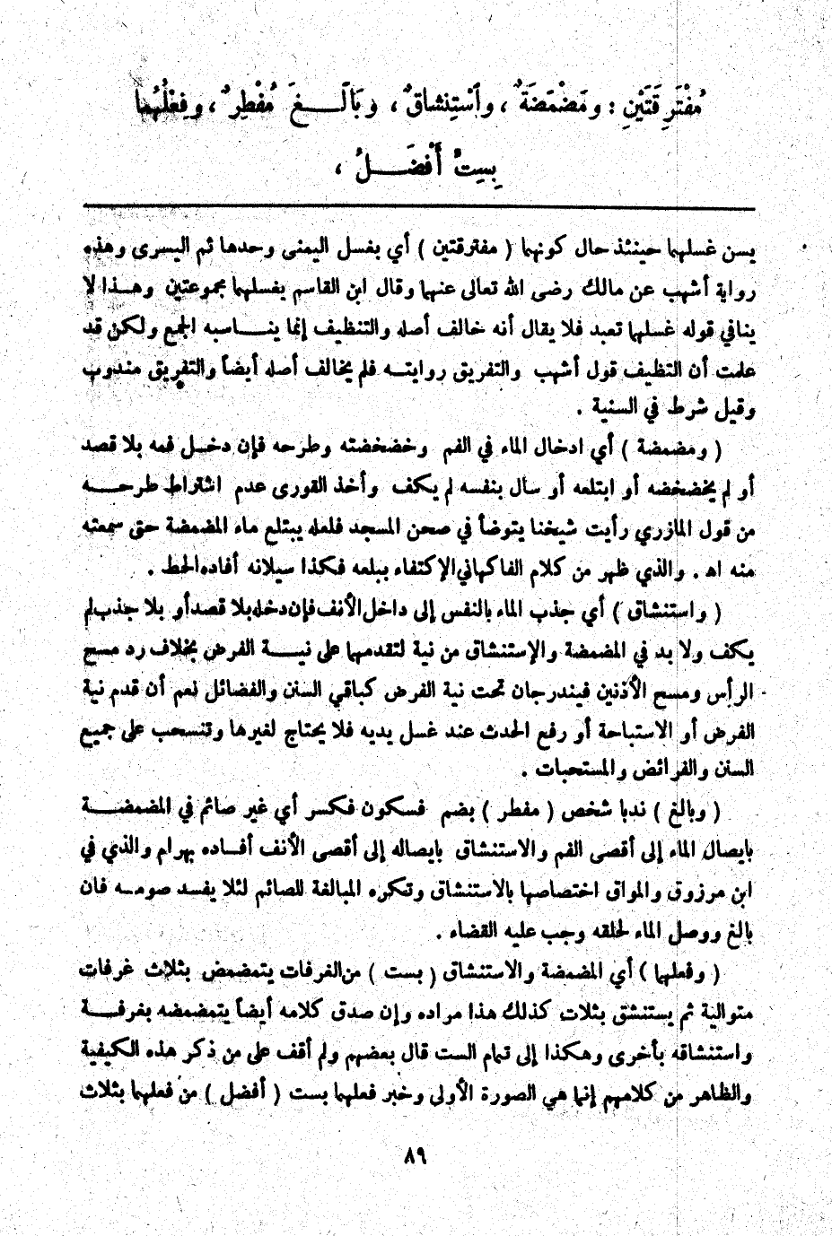 (وَبَالَغَ) نَدْبًا شَخْصٌ (مُفْطِرٌ) بِضَمٍّ فَسُكُونٍ فَكَسْرٍ أَيْ غَيْرُ صَائِمٍ فِي الْمَضْمَضَةِ بِإِيصَالِ الْمَاءِ إلَى أَقْصَى الْفَمِ وَالِاسْتِنْشَاقِ بِإِيصَالِهِ إلَى أَقْصَى الْأَنْفِ أَفَادَهُ بَهْرَامُ وَاَلَّذِي فِي ابْنِ مَرْزُوقٍ وَالْمَوَّاقِ اخْتِصَاصُهَا بِالِاسْتِنْشَاقِ وَتُكْرَهُ الْمُبَالَغَةُ لِلصَّائِمِ لِئَلَّا يَفْسُدَ صَوْمُهُ فَإِنْ بَالَغَ وَوَصَلَ الْمَاءُ لِحَلْقِهِ وَجَبَ عَلَيْهِ الْقَضَاءُ. (وَفِعْلُهُمَا) أَيْ الْمَضْمَضَةِ وَالِاسْتِنْشَاقِ (بِسِتٍّ) مِنْ الْغَرَفَاتِ يَتَمَضْمَضُ بِثَلَاثِ غَرَفَاتٍ مُتَوَالِيَةٍ ثُمَّ يَسْتَنْشِقُ بِثَلَاثٍ كَذَلِكَ هَذَا مُرَادُهُ وَإِنْ صَدَقَ كَلَامُهُ أَيْضًا يَتَمَضْمَضُ بِغَرْفَةٍ وَاسْتِنْشَاقُهُ بِأُخْرَى وَهَكَذَا إلَى تَمَامِ السِّتِّ قَالَ بَعْضُهُمْ: وَلَمْ أَقِفْ عَلَى مَنْ ذَكَرَ هَذِهِ الْكَيْفِيَّةَ وَالظَّاهِرُ مِنْ كَلَامِهِمْ إنَّمَا هِيَ الصُّورَةُ الْأُولَى وَخَبَرُ فِعْلِهِمَا بِسِتٍّ (أَفْضَلُ) مِنْ فِعْلِهِمَا بِثَلَاثِ