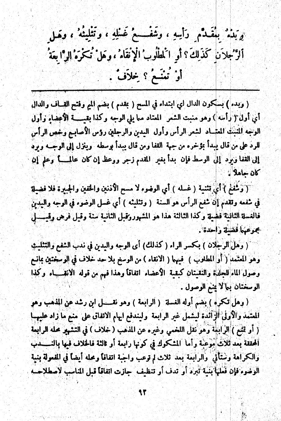 وَبَدْءٌ بِمُقَدَّمِ رَأْسِهِ، وَشَفْعُ غَسْلِهِ، وَتَثْلِيثُهُ، وَهَلْ الرِّجْلَانِ كَذَلِكَ؟ أَوْ الْمَطْلُوبُ الْإِنْقَاءُ، وَهَلْ تُكْرَهُ الرَّابِعَةُ أَوْ تُمْنَعُ؟ خِلَافٌ