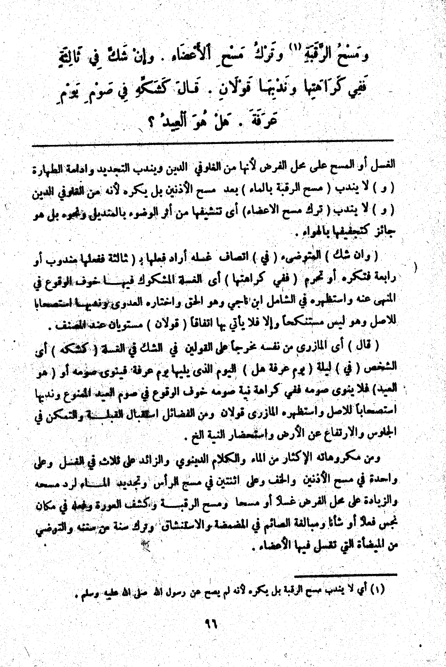 (قَالَ) أَيْ الْمَازِرِيُّ مِنْ نَفْسِهِ مُخَرِّجًا عَلَى الْقَوْلَيْنِ فِي الشَّكِّ فِي الْغَسْلَةِ (كَشَكِّهِ) أَيْ الشَّخْصِ (فِي) لَيْلَةِ (يَوْمِ عَرَفَةَ هَلْ) الْيَوْمُ الَّذِي يَلِيهَا يَوْمُ عَرَفَةَ فَيَنْوِي صَوْمَهُ أَوْ (هُوَ الْعِيدُ) فَلَا يَنْوِي صَوْمَهُ فَفِي كَرَاهَةِ نِيَّةِ صَوْمِهِ خَوْفُ الْوُقُوعِ فِي صَوْمِ الْعِيدِ الْمَمْنُوعِ وَنَدْبِهَا اسْتِصْحَابٌ لِلْأَصْلِ وَاسْتَظْهَرَهُ الْمَازِرِيُّ قَوْلَانِ وَمِنْ الْفَضَائِلِ: اسْتِقْبَالُ الْقِبْلَةِ وَالتَّمَكُّنُ فِي الْجُلُوسِ، وَالِارْتِفَاعُ عَنْ الْأَرْضِ، وَاسْتِحْضَارُ النِّيَّةِ. إلَخْ