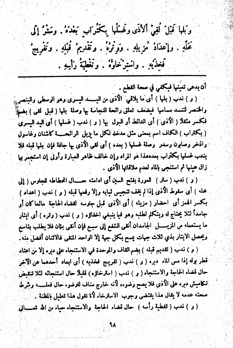 (وَ) نُدِبَ (بَلُّهَا) أَيْ مَا يُلَاقِي الْأَذَى مِنْ الْيَدِ الْيُسْرَى وَهُوَ الْوُسْطَى وَالْبِنْصِرُ وَالْخِنْصِرُ لِتَنْسَدَّ مَسَامُّهَا فَيَضْعُفُ تَعَلُّقُ رَائِحَةِ النَّجَاسَةِ بِهَا وَصِلَةُ بَلُّهَا (قَبْلَ لُقِيِّ) بِضَمٍّ فَكَسْرٍ مُثَقَّلًا (الْأَذَى) أَيْ الْغَائِطِ أَوْ الْبَوْلِ بِهَا (وَ) نُدِبَ (غَسْلُهَا) أَيْ الْيَدِ الْيُسْرَى (بِكَتُرَابٍ) الْكَافُ اسْمٌ بِمَعْنَى مِثْلَ مُدْخِلَةٌ لِكُلِّ مَا يُزِيلُ الرَّائِحَةَ كَأُشْنَانٍ وَغَاسُولٍ وَإِذْخِرٍ وَصَابُونٍ وَسِدْرٍ وَصِلَةُ غَسْلِهَا (بَعْدَهُ) أَيْ لُقِيِّ الْأَذَى بِهَا جَافَّةً فَإِنْ بَلَّهَا قَبْلَهُ فَلَا يُنْدَبُ غَسْلُهَا بِكَتُرَابٍ بَعْدَهُ هَذَا هُوَ الْمُرَادُ وَإِنْ خَالَفَ ظَاهِرَ الْعِبَارَةِ وَأَوْلَى إنْ اسْتَجْمَرَ بِمَا زَالَ عَيْنَهَا ثُمَّ اسْتَنْجَى بِالْمَاءِ لِعَدَمِ مُلَاقَاتِهَا الْأَذَى. .