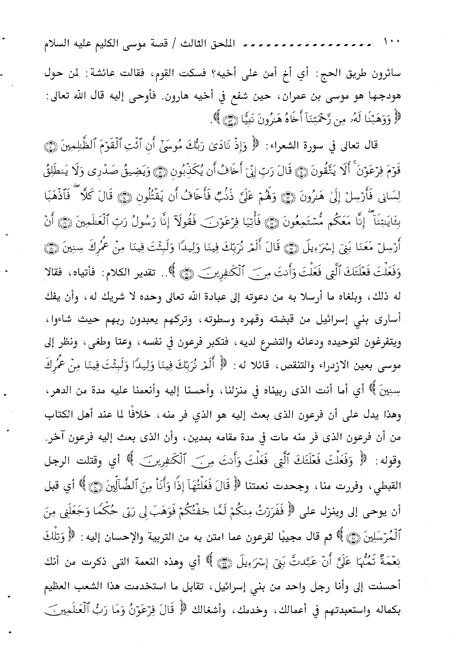 قال تعالى في سورة الشعراء: وإِذْ نادى رَبُّكَ مُوسى أَنِ ائْتِ الْقَوْمَ الظَّالِمِينَ (10) قَوْمَ فِرْعَوْنَ أَلا يَتَّقُونَ (11) قالَ رَبِّ إِنِّي أَخافُ أَنْ يُكَذِّبُونِ (12) ويَضِيقُ صَدْرِي ولا يَنْطَلِقُ لِسانِي فَأَرْسِلْ إِلى هارُونَ (13) ولَهُمْ عَلَيَّ ذَنْبٌ فَأَخافُ أَنْ يَقْتُلُونِ (14) قالَ كَلَّا فَاذْهَبا بِآياتِنا إِنَّا مَعَكُمْ مُسْتَمِعُونَ (15) فَاتِيا فِرْعَوْنَ فَقُولا إِنَّا رَسُولُ رَبِّ الْعالَمِينَ (16) أَنْ أَرْسِلْ مَعَنا بَنِي إِسْرائِيلَ (17) قالَ أَلَمْ نُرَبِّكَ فِينا وَلِيداً ولَبِثْتَ فِينا مِنْ عُمُرِكَ سِنِينَ (18) وفَعَلْتَ فَعْلَتَكَ الَّتِي فَعَلْتَ وأَنْتَ مِنَ الْكافِرِينَ (19) ... تقدير الكلام: فأتياه، فقالا له ذلك، وبلغاه ما أرسلا به من دعوته إلى عبادة اللّه تعالى وحده لا شريك له، وأن يفك أسارى بني إسرائيل من قبضته وقهره وسطوته، وتركهم يعبدون ربهم حيث شاءوا، ويتفرغون لتوحيده ودعائه والتضرع لديه، فتكبر فرعون في نفسه، وعتا وطغى، ونظر إلى موسى بعين الازدراء والتنقص، قائلا له: أَلَمْ نُرَبِّكَ فِينا وَلِيداً ولَبِثْتَ فِينا مِنْ عُمُرِكَ سِنِينَ أي أما أنت الذى ربيناه في منزلنا، وأحسنا إليه وأنعمنا عليه مدة من الدهر، وهذا يدل على أن فرعون الذى بعث إليه هو الذي فر منه، خلافا لما عند أهل الكتاب من أن فرعون الذى فر منه مات في مدة مقامه بمدين، وأن الذى بعث إليه فرعون آخر.
