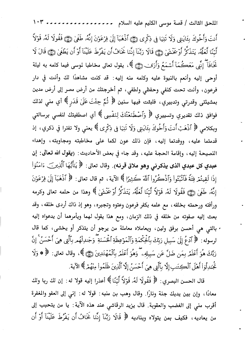 أَنْتَ وأَخُوكَ بِآياتِي ولا تَنِيا فِي ذِكْرِي (42) اذْهَبا إِلى فِرْعَوْنَ إِنَّهُ طَغى (43) فَقُولا لَهُ قَوْلًا لَيِّناً لَعَلَّهُ يَتَذَكَّرُ أَوْ يَخْشى (44) قالا رَبَّنا إِنَّنا نَخافُ أَنْ يَفْرُطَ عَلَيْنا أَوْ أَنْ يَطْغى (45) قالَ لا تَخافا إِنَّنِي مَعَكُما أَسْمَعُ وأَرى (46)، يقول تعالى مخاطبا لموسى فيما كلمه به ليلة أوحى إليه وأنعم بالنبوة عليه وكلمه منه إليه: قد كنت مشاهدا لك وأنت في دار فرعون، وأنت تحت كنفي وحفظي ولطفي، ثم أخرجتك من أرض مصر إلى أرض مدين بمشيئتى وقدرتي وتدبيري، فلبثت فيها سنين ثُمَّ جِئْتَ عَلى قَدَرٍ أي مني لذلك فوافق ذلك تقديري وتسييري واصْطَنَعْتُكَ لِنَفْسِي أي اصطفيتك لنفسي برسالتي وبكلامي اذْهَبْ أَنْتَ وأَخُوكَ بِآياتِي ولا تَنِيا فِي ذِكْرِي يعني ولا تفترا في ذكري، إذ قدمتما عليه، ووفدتما إليه، فإن ذلك عون لكما على مخاطبته ومجاوبته، وإهداء النصيحة إليه، وإقامة الحجة عليه، وقد جاء في بعض الأحاديث: (يقول اللّه تعالى: إن عبدي كل عبدي الذى يذكرني وهو ملاق قرنه). وقال تعالى: يا أَيُّهَا الَّذِينَ آمَنُوا إِذا لَقِيتُمْ فِئَةً فَاثْبُتُوا واذْكُرُوا اللَّهَ كَثِيراً الآية، ثم قال تعالى: اذْهَبا إِلى فِرْعَوْنَ إِنَّهُ طَغى (43) فَقُولا لَهُ قَوْلًا لَيِّناً لَعَلَّهُ يَتَذَكَّرُ أَوْ يَخْشى وهذا من حلمه تعالى وكرمه ورأفته ورحمته بخلقه، مع علمه بكفر فرعون وعتوه وتجبره، وهو إذ ذاك أردى خلقه، وقد بعث إليه صفوته من خلقه في ذلك الزمان، ومع هذا يقول لهما ويأمرهما أن يدعواه إليه بالتي هي أحسن برفق ولين، ويعاملاه معاملة من يرجو أن يتذكر أو يخشى، كما قال لرسوله: ادْعُ إِلى سَبِيلِ رَبِّكَ بِالْحِكْمَةِ والْمَوْعِظَةِ الْحَسَنَةِ وجادِلْهُمْ بِالَّتِي هِيَ أَحْسَنُ إِنَّ رَبَّكَ هُوَ أَعْلَمُ بِمَنْ ضَلَّ عَنْ سَبِيلِهِ وهُوَ أَعْلَمُ بِالْمُهْتَدِينَ (125)، وقال تعالى:* ولا تُجادِلُوا أَهْلَ الْكِتابِ إِلَّا بِالَّتِي هِيَ أَحْسَنُ إِلَّا الَّذِينَ ظَلَمُوا مِنْهُمْ الآية.