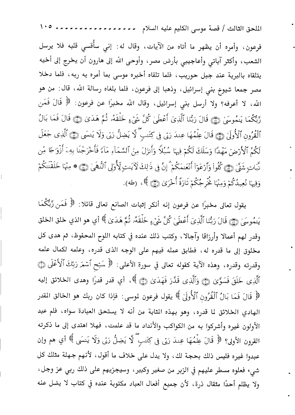 فرعون، وأمره أن يظهر ما أتاه من الآيات، وقال له: إني سأقسي قلبه فلا يرسل الشعب، وأكثر آياتي وأعاجيبي بأرض مصر، وأوحى اللّه إلى هارون أن يخرج إلى أخيه يتلقاه بالبرية عند جبل حوريب، فلما تلقاه أخبره موسى بما أمره به ربه، فلما دخلا مصر جمعا شيوخ بني إسرائيل، وذهبا إلى فرعون، فلما بلغاه رسالة اللّه، قال: من هو اللّه، لا أعرفه؟ ولا أرسل بني إسرائيل، وقال اللّه مخبرا عن فرعون: قالَ فَمَنْ رَبُّكُما يا مُوسى (49) قالَ رَبُّنَا الَّذِي أَعْطى كُلَّ شَيْءٍ خَلْقَهُ ثُمَّ هَدى (50) قالَ فَما بالُ الْقُرُونِ الْأُولى (51) قالَ عِلْمُها عِنْدَ رَبِّي فِي كِتابٍ لا يَضِلُّ رَبِّي ولا يَنْسى (52) الَّذِي جَعَلَ لَكُمُ الْأَرْضَ مَهْداً وسَلَكَ لَكُمْ فِيها سُبُلًا وأَنْزَلَ مِنَ السَّماءِ ماءً فَأَخْرَجْنا بِهِ أَزْواجاً مِنْ نَباتٍ شَتَّى (53) كُلُوا وارْعَوْا أَنْعامَكُمْ إِنَّ فِي ذلِكَ لَآياتٍ لِأُولِي النُّهى (54) مِنْها خَلَقْناكُمْ وفِيها نُعِيدُكُمْ ومِنْها نُخْرِجُكُمْ تارَةً أُخْرى (55)، (طه).
