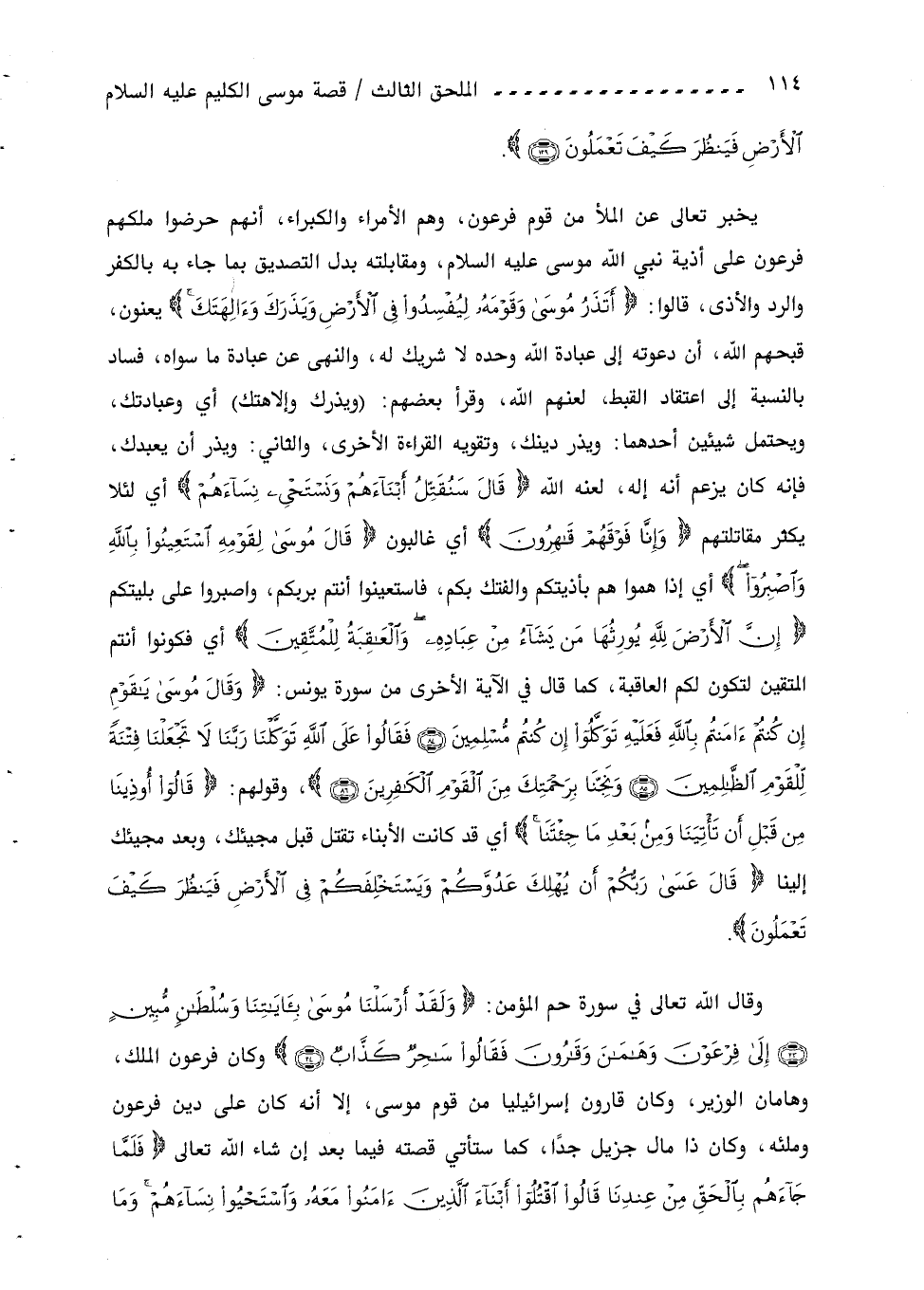 وقال اللّه تعالى في سورة حم المؤمن: ولَقَدْ أَرْسَلْنا مُوسى بِآياتِنا وسُلْطانٍ مُبِينٍ (23) إِلى فِرْعَوْنَ وهامانَ وقارُونَ فَقالُوا ساحِرٌ كَذَّابٌ (24) وكان فرعون الملك، وهامان الوزير، وكان قارون إسرائيليا من قوم موسى، إلا أنه كان على دين فرعون وملئه، وكان ذا مال جزيل جدا، كما ستأتي قصته فيما بعد إن شاء اللّه تعالى فَلَمَّا جاءَهُمْ بِالْحَقِّ مِنْ عِنْدِنا قالُوا اقْتُلُوا أَبْناءَ الَّذِينَ آمَنُوا مَعَهُ واسْتَحْيُوا نِساءَهُمْ وما