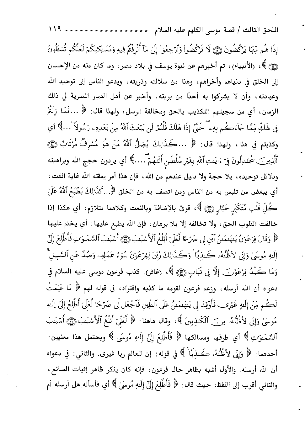 إِذا هُمْ مِنْها يَرْكُضُونَ (12) لا تَرْكُضُوا وارْجِعُوا إِلى ما أُتْرِفْتُمْ فِيهِ ومَساكِنِكُمْ لَعَلَّكُمْ تُسْئَلُونَ (13)، (الأنبياء)، ثم أخبرهم عن نبوة يوسف في بلاد مصر، وما كان منه من الإحسان إلى الخلق في دنياهم وأخراهم، وهذا من سلالته وذريته، ويدعو الناس إلى توحيد اللّه وعبادته، وأن لا يشركوا به أحدا من بريته، وأخبر عن أهل الديار المصرية في ذلك الزمان، أي من سجيتهم التكذيب بالحق ومخالفة الرسل، ولهذا قال: ... فَما زِلْتُمْ فِي شَكٍّ مِمَّا جاءَكُمْ بِهِ حَتَّى إِذا هَلَكَ قُلْتُمْ لَنْ يَبْعَثَ اللَّهُ مِنْ بَعْدِهِ رَسُولًا ... أي وكذبتم في هذا، ولهذا قال: ... كَذلِكَ يُضِلُّ اللَّهُ مَنْ هُوَ مُسْرِفٌ مُرْتابٌ (34) الَّذِينَ يُجادِلُونَ فِي آياتِ اللَّهِ بِغَيْرِ سُلْطانٍ أَتاهُمْ ... أي يردون حجج اللّه وبراهينه ودلائل توحيده، بلا حجة ولا دليل عندهم من اللّه، فإن هذا أمر يمقته اللّه غاية المقت، أي يبغض من تلبس به من الناس ومن اتصف به من الخلق ... كَذلِكَ يَطْبَعُ اللَّهُ عَلى كُلِّ قَلْبِ مُتَكَبِّرٍ جَبَّارٍ (35)، قرئ بالإضافة وبالنعت وكلاهما متلازم، أي هكذا إذا خالفت القلوب الحق، ولا تخالفه إلا بلا برهان، فإن اللّه يطبع عليها: أي يختم عليها وقالَ فِرْعَوْنُ يا هامانُ ابْنِ لِي صَرْحاً لَعَلِّي أَبْلُغُ الْأَسْبابَ (36) أَسْبابَ السَّماواتِ فَأَطَّلِعَ إِلى إِلهِ مُوسى وإِنِّي لَأَظُنُّهُ كاذِباً وكَذلِكَ زُيِّنَ لِفِرْعَوْنَ سُوءُ عَمَلِهِ وصُدَّ عَنِ السَّبِيلِ وما كَيْدُ فِرْعَوْنَ إِلَّا فِي تَبابٍ (37)، (غافر). كذب فرعون موسى عليه السلام في دعواه أن اللّه أرسله، وزعم فرعون لقومه ما كذبه وافتراه، في قوله لهم ما عَلِمْتُ لَكُمْ مِنْ إِلهٍ غَيْرِي فَأَوْقِدْ لِي يا هامانُ عَلَى الطِّينِ فَاجْعَلْ لِي صَرْحاً لَعَلِّي أَطَّلِعُ إِلى إِلهِ مُوسى وإِنِّي لَأَظُنُّهُ مِنَ الْكاذِبِينَ، وقال هاهنا: لَعَلِّي أَبْلُغُ الْأَسْبابَ (36) أَسْبابَ السَّماواتِ أي طرقها ومسالكها فَأَطَّلِعَ إِلى إِلهِ مُوسى ويحتمل هذا معنيين: