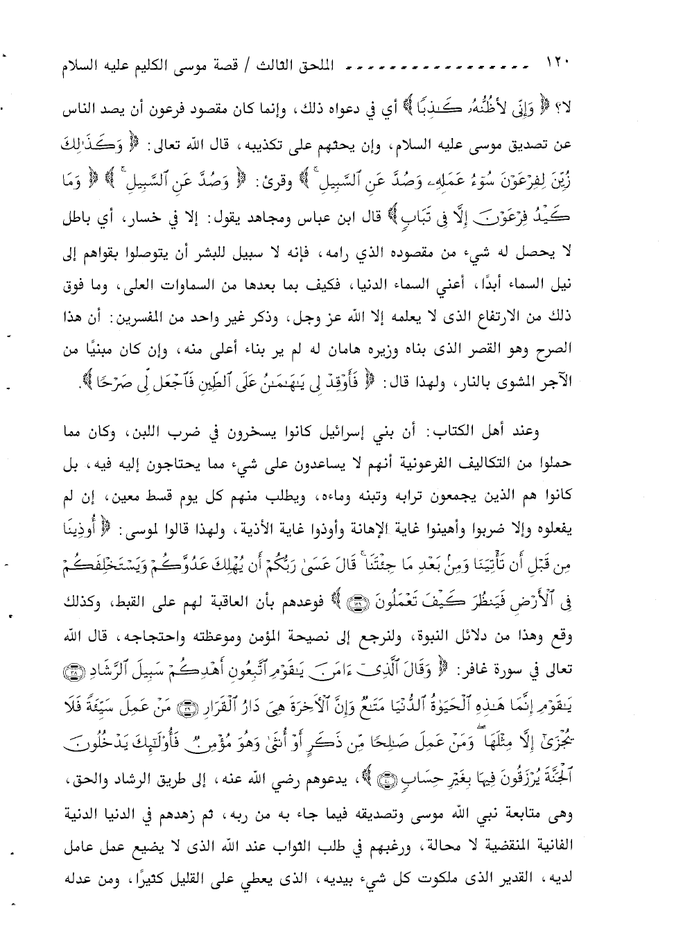 وعند أهل الكتاب: أن بني إسرائيل كانوا يسخرون في ضرب اللبن، وكان مما حملوا من التكاليف الفرعونية أنهم لا يساعدون على شيء مما يحتاجون إليه فيه، بل كانوا هم الذين يجمعون ترابه وتبنه وماءه، ويطلب منهم كل يوم قسط معين، إن لم يفعلوه وإلا ضربوا وأهينوا غاية الإهانة وأوذوا غاية الأذية، ولهذا قالوا لموسى: أُوذِينا مِنْ قَبْلِ أَنْ تَاتِيَنا ومِنْ بَعْدِ ما جِئْتَنا قالَ عَسى رَبُّكُمْ أَنْ يُهْلِكَ عَدُوَّكُمْ ويَسْتَخْلِفَكُمْ فِي الْأَرْضِ فَيَنْظُرَ كَيْفَ تَعْمَلُونَ (129) فوعدهم بأن العاقبة لهم على القبط، وكذلك وقع وهذا من دلائل النبوة، ولنرجع إلى نصيحة المؤمن وموعظته واحتجاجه، قال اللّه تعالى في سورة غافر: وقالَ الَّذِي آمَنَ يا قَوْمِ اتَّبِعُونِ أَهْدِكُمْ سَبِيلَ الرَّشادِ (38) يا قَوْمِ إِنَّما هذِهِ الْحَياةُ الدُّنْيا مَتاعٌ وإِنَّ الْآخِرَةَ هِيَ دارُ الْقَرارِ (39) مَنْ عَمِلَ سَيِّئَةً فَلا يُجْزى إِلَّا مِثْلَها ومَنْ عَمِلَ صالِحاً مِنْ ذَكَرٍ أَوْ أُنْثى وهُوَ مُؤْمِنٌ فَأُولئِكَ يَدْخُلُونَ الْجَنَّةَ يُرْزَقُونَ فِيها بِغَيْرِ حِسابٍ (40)، يدعوهم رضي اللّه عنه، إلى طريق الرشاد والحق، وهى متابعة نبي اللّه موسى وتصديقه فيما جاء به من ربه، ثم زهدهم في الدنيا الدنية الفانية المنقضية لا محالة، ورغبهم في طلب الثواب عند اللّه الذى لا يضيع عمل عامل لديه، القدير الذى ملكوت كل شيء بيديه، الذى يعطي على القليل كثيرا، ومن عدله