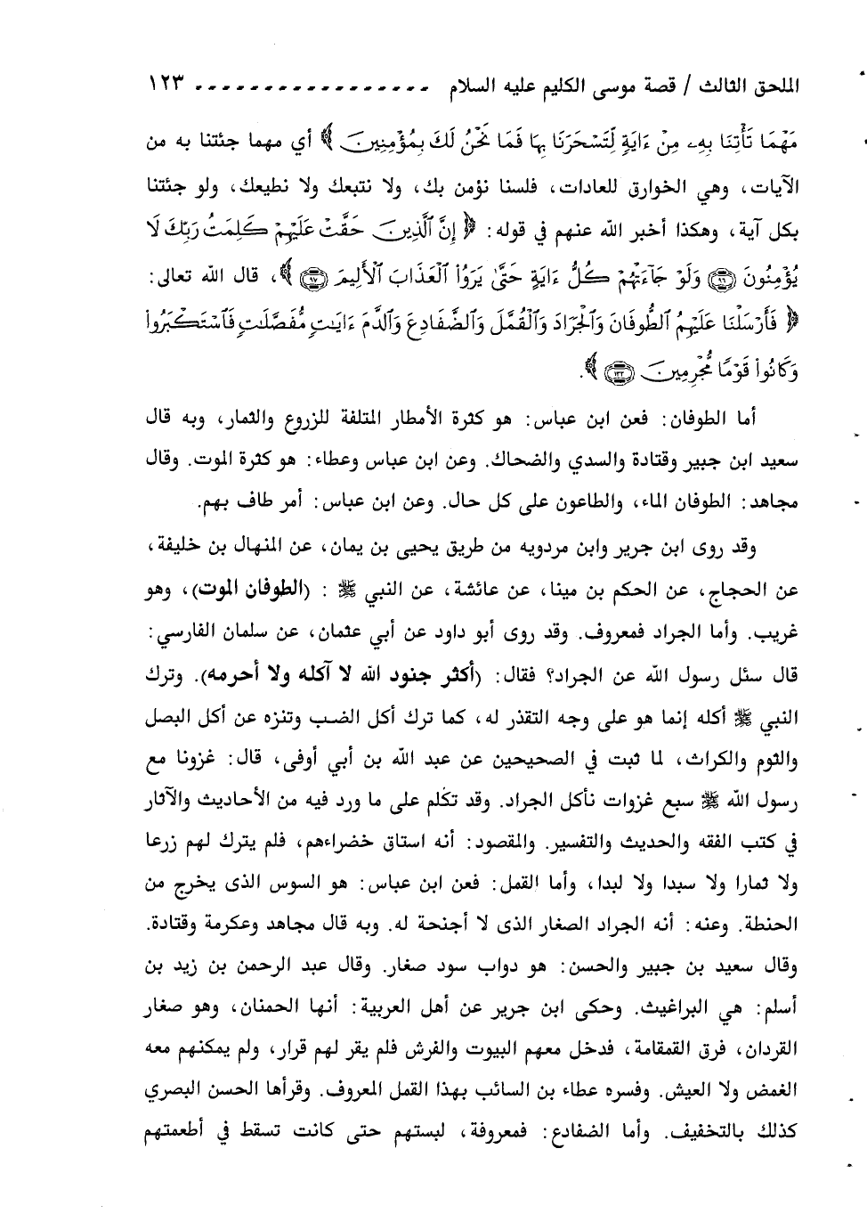 قال سئل رسول اللّه عن الجراد؟ فقال: (أكثر جنود اللّه لا آكله ولا أحرمه). وترك النبي صلّى اللّه عليه وسلم أكله إنما هو على وجه التقذر له، كما ترك أكل الضب وتنزه عن أكل البصل والثوم والكراث، لما ثبت في الصحيحين عن عبد اللّه بن أبي أوفى، قال: غزونا مع رسول اللّه صلّى اللّه عليه وسلم سبع غزوات نأكل الجراد. وقد تكلم على ما ورد فيه من الأحاديث والآثار في كتب الفقه والحديث والتفسير. والمقصود: أنه استاق خضراءهم، فلم يترك لهم زرعا ولا ثمارا ولا سبدا ولا لبدا، وأما القمل: فعن ابن عباس: هو السوس الذى يخرج من الحنطة. وعنه: أنه الجراد الصغار الذى لا أجنحة له. وبه قال مجاهد وعكرمة وقتادة.