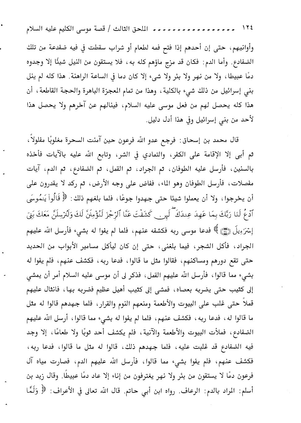 قال محمد بن إسحاق: فرجع عدو اللّه فرعون حين آمنت السحرة مغلوبا مفلولا، ثم أبى إلا الإقامة على الكفر، والتمادي في الشر، وتابع اللّه عليه بالآيات فأخذه بالسنين، فأرسل عليه الطوفان، ثم الجراد، ثم القمل، ثم الضفادع، ثم الدم، آيات مفصلات، فأرسل الطوفان وهو الماء، ففاض على وجه الأرض، ثم ركد لا يقدرون على أن يخرجوا، ولا أن يعملوا شيئا حتى جهدوا جوعا، فلما بلغهم ذلك: قالُوا يا مُوسَى ادْعُ لَنا رَبَّكَ بِما عَهِدَ عِنْدَكَ لَئِنْ كَشَفْتَ عَنَّا الرِّجْزَ لَنُؤْمِنَنَّ لَكَ ولَنُرْسِلَنَّ مَعَكَ بَنِي إِسْرائِيلَ (134) فدعا موسى ربه فكشفه عنهم، فلما لم يفوا له بشيء فأرسل اللّه عليهم الجراد، فأكل الشجر، فيما بلغنى، حتى إن كان ليأكل مسامير الأبواب من الحديد حتى تقع دورهم ومساكنهم، فقالوا مثل ما قالوا، فدعا ربه، فكشف عنهم، فلم يفوا له بشيء مما قالوا، فأرسل اللّه عليهم القمل، فذكر لى أن موسى عليه السلام أمر أن يمشي إلى كثيب حتى يضربه بعصاه، فمشى إلى كثيب أهيل عظيم فضربه بها، فانثال عليهم قملا حتى غلب على البيوت والأطعمة ومنعهم النوم والقرار، فلما جهدهم قالوا له مثل ما قالوا له، فدعا ربه، فكشف عنهم، فلما لم يفوا له بشيء مما قالوا، أرسل اللّه عليهم الضفادع، فملأت البيوت والأطعمة والآنية، فلم يكشف أحد ثوبا ولا طعاما، إلا وجد فيه الضفادع قد غلبت عليه، فلما جهدهم ذلك، قالوا له مثل ما قالوا، فدعا ربه، فكشف عنهم، فلم يفوا بشيء مما قالوا، فأرسل اللّه عليهم الدم، فصارت مياه آل فرعون دما لا يستقون من بئر ولا نهر يغترفون من إناء إلا عاد دما عبيطا. وقال زيد بن أسلم: المراد بالدم: الرعاف. رواه ابن أبي حاتم. قال اللّه تعالى في الأعراف: ولَمَّا