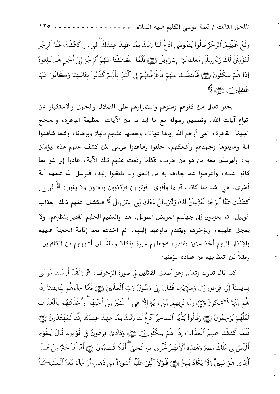كما قال تبارك وتعالى وهو أصدق القائلين في سورة الزخرف: ولَقَدْ أَرْسَلْنا مُوسى بِآياتِنا إِلى فِرْعَوْنَ ومَلَائِهِ فَقالَ إِنِّي رَسُولُ رَبِّ الْعالَمِينَ (46) فَلَمَّا جاءَهُمْ بِآياتِنا إِذا هُمْ مِنْها يَضْحَكُونَ (47) وما نُرِيهِمْ مِنْ آيَةٍ إِلَّا هِيَ أَكْبَرُ مِنْ أُخْتِها وأَخَذْناهُمْ بِالْعَذابِ لَعَلَّهُمْ يَرْجِعُونَ (48) وقالُوا يا أَيُّهَا السَّاحِرُ ادْعُ لَنا رَبَّكَ بِما عَهِدَ عِنْدَكَ إِنَّنا لَمُهْتَدُونَ (49) فَلَمَّا كَشَفْنا عَنْهُمُ الْعَذابَ إِذا هُمْ يَنْكُثُونَ (50) ونادى فِرْعَوْنُ فِي قَوْمِهِ قالَ يا قَوْمِ أَلَيْسَ لِي مُلْكُ مِصْرَ وهذِهِ الْأَنْهارُ تَجْرِي مِنْ تَحْتِي أَفَلا تُبْصِرُونَ (51) أَمْ أَنَا خَيْرٌ مِنْ هذَا الَّذِي هُوَ مَهِينٌ ولا يَكادُ يُبِينُ (52) فَلَوْ لا أُلْقِيَ عَلَيْهِ أَسْوِرَةٌ مِنْ ذَهَبٍ أَوْ جاءَ مَعَهُ الْمَلائِكَةُ