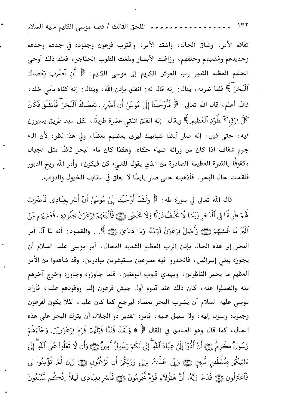 قال اللّه تعالى في سورة طه: ولَقَدْ أَوْحَيْنا إِلى مُوسى أَنْ أَسْرِ بِعِبادِي فَاضْرِبْ لَهُمْ طَرِيقاً فِي الْبَحْرِ يَبَساً لا تَخافُ دَرَكاً ولا تَخْشى (77) فَأَتْبَعَهُمْ فِرْعَوْنُ بِجُنُودِهِ فَغَشِيَهُمْ مِنَ الْيَمِّ ما غَشِيَهُمْ (78) وأَضَلَّ فِرْعَوْنُ قَوْمَهُ وما هَدى (79) ... والمقصود: أنه لما آل أمر البحر إلى هذه الحال بإذن الرب العظيم الشديد المحال، أمر موسى عليه السلام أن يجوزه ببني إسرائيل، فانحدروا فيه مسرعين مستبشرين مبادرين، وقد شاهدوا من الأمر العظيم ما يحير الناظرين، ويهدي قلوب المؤمنين، فلما جاوزوه وجاوزه وخرج آخرهم منه وانفصلوا عنه، كان ذلك عند قدوم أول جيش فرعون إليه ووفودهم عليه، فأراد موسى عليه السلام أن يضرب البحر بعصاه ليرجع كما كان عليه، لئلا يكون لفرعون وجنوده وصول إليه، ولا سبيل عليه، فأمره القدير ذو الجلال أن يترك البحر على هذه الحال، كما قال وهو الصادق في المقال * ولَقَدْ فَتَنَّا قَبْلَهُمْ قَوْمَ فِرْعَوْنَ وجاءَهُمْ رَسُولٌ كَرِيمٌ (17) أَنْ أَدُّوا إِلَيَّ عِبادَ اللَّهِ إِنِّي لَكُمْ رَسُولٌ أَمِينٌ (18) وأَنْ لا تَعْلُوا عَلَى اللَّهِ إِنِّي آتِيكُمْ بِسُلْطانٍ مُبِينٍ (19) وإِنِّي عُذْتُ بِرَبِّي ورَبِّكُمْ أَنْ تَرْجُمُونِ (20) وإِنْ لَمْ تُؤْمِنُوا لِي فَاعْتَزِلُونِ (21) فَدَعا رَبَّهُ أَنَّ هؤُلاءِ قَوْمٌ مُجْرِمُونَ (22) فَأَسْرِ بِعِبادِي لَيْلًا إِنَّكُمْ مُتَّبَعُونَ