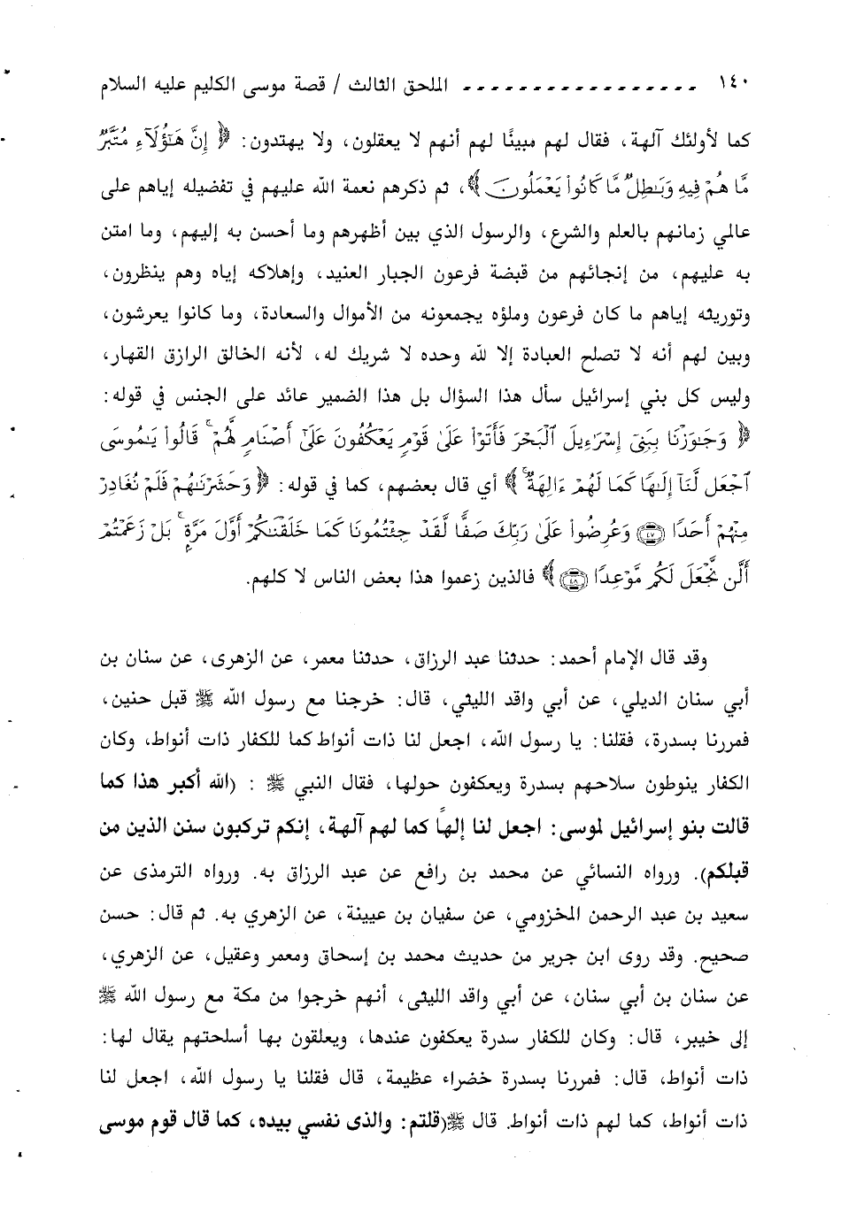وقد قال الإمام أحمد: حدثنا عبد الرزاق، حدثنا معمر، عن الزهرى، عن سنان بن أبي سنان الديلي، عن أبي واقد الليثي، قال: خرجنا مع رسول اللّه صلّى اللّه عليه وسلم قبل حنين، فمررنا بسدرة، فقلنا: يا رسول اللّه، اجعل لنا ذات أنواط كما للكفار ذات أنواط، وكان الكفار ينوطون سلاحهم بسدرة ويعكفون حولها، فقال النبي صلّى اللّه عليه وسلم: (اللّه أكبر هذا كما قالت بنو إسرائيل لموسى: اجعل لنا إلها كما لهم آلهة، إنكم تركبون سنن الذين من قبلكم). ورواه النسائي عن محمد بن رافع عن عبد الرزاق به. ورواه الترمذى عن سعيد بن عبد الرحمن المخزومي، عن سفيان بن عيينة، عن الزهري به. ثم قال: حسن صحيح. وقد روى ابن جرير من حديث محمد بن إسحاق ومعمر وعقيل، عن الزهري، عن سنان بن أبي سنان، عن أبي واقد الليثي، أنهم خرجوا من مكة مع رسول اللّه صلّى اللّه عليه وسلم إلى خيبر، قال: وكان للكفار سدرة يعكفون عندها، ويعلقون بها أسلحتهم يقال لها: