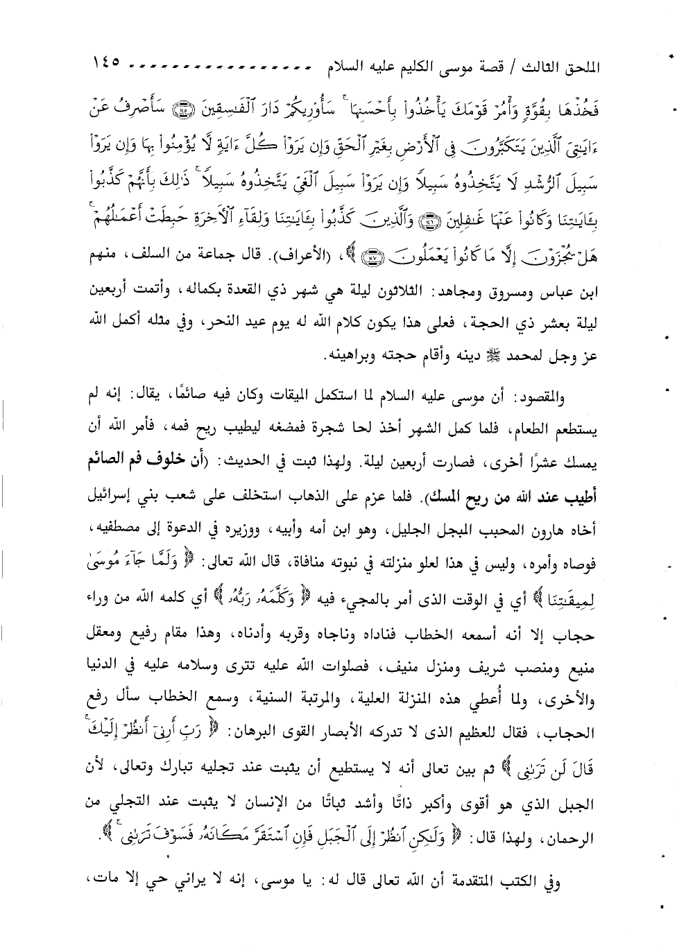 فَخُذْها بِقُوَّةٍ وامُرْ قَوْمَكَ يَاخُذُوا بِأَحْسَنِها سَأُرِيكُمْ دارَ الْفاسِقِينَ (145) سَأَصْرِفُ عَنْ آياتِيَ الَّذِينَ يَتَكَبَّرُونَ فِي الْأَرْضِ بِغَيْرِ الْحَقِّ وإِنْ يَرَوْا كُلَّ آيَةٍ لا يُؤْمِنُوا بِها وإِنْ يَرَوْا سَبِيلَ الرُّشْدِ لا يَتَّخِذُوهُ سَبِيلًا وإِنْ يَرَوْا سَبِيلَ الغَيِّ يَتَّخِذُوهُ سَبِيلًا ذلِكَ بِأَنَّهُمْ كَذَّبُوا بِآياتِنا وكانُوا عَنْها غافِلِينَ (146) والَّذِينَ كَذَّبُوا بِآياتِنا ولِقاءِ الْآخِرَةِ حَبِطَتْ أَعْمالُهُمْ هَلْ يُجْزَوْنَ إِلَّا ما كانُوا يَعْمَلُونَ (147)، (الأعراف). قال جماعة من السلف، منهم ابن عباس ومسروق ومجاهد: الثلاثون ليلة هي شهر ذي القعدة بكماله، وأتمت أربعين ليلة بعشر ذي الحجة، فعلى هذا يكون كلام اللّه له يوم عيد النحر، وفي مثله أكمل اللّه عز وجل لمحمد صلّى اللّه عليه وسلم دينه وأقام حجته وبراهينه.