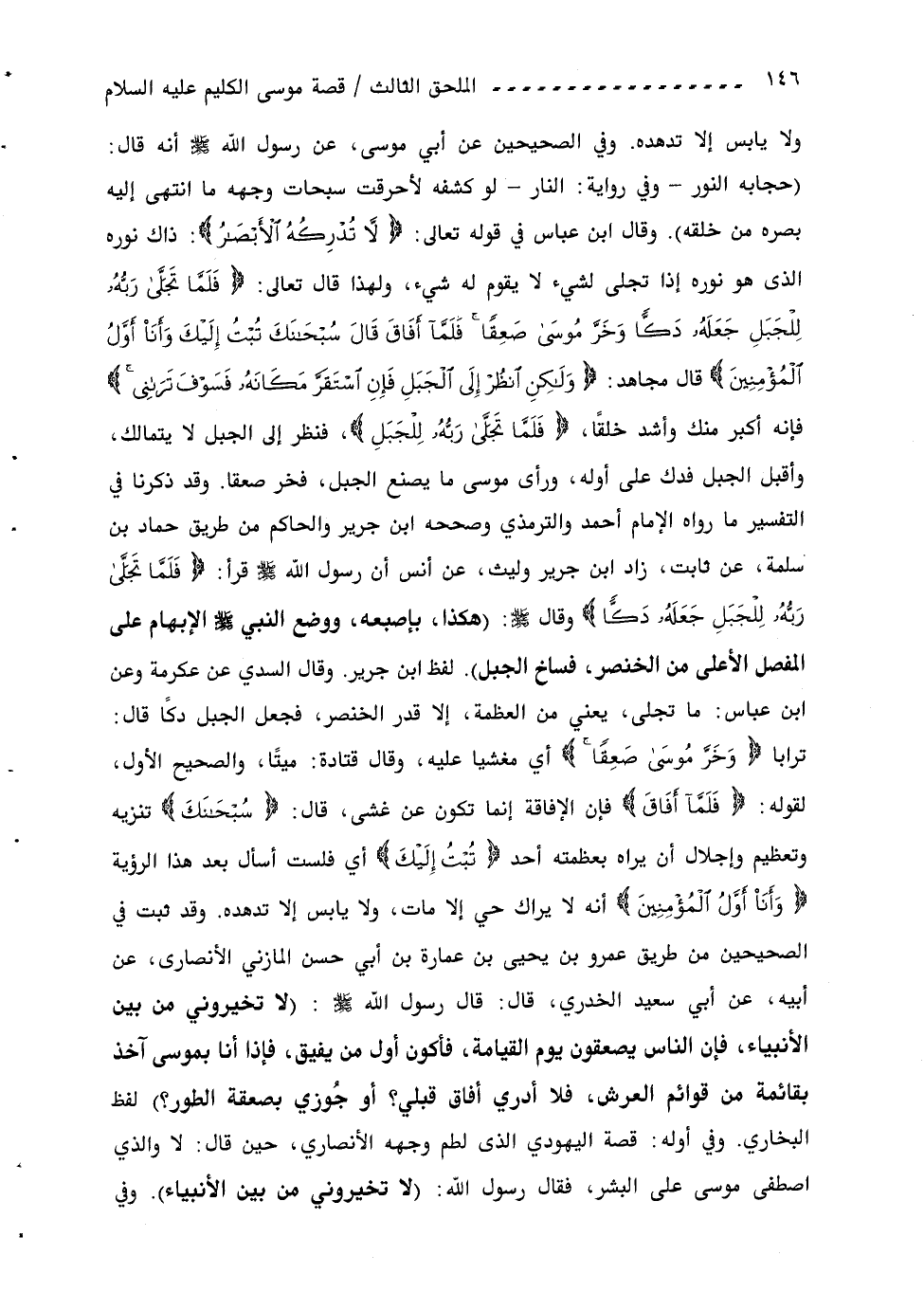 (حجابه النور - وفي رواية: النار - لو كشفه لأحرقت سبحات وجهه ما انتهى إليه بصره من خلقه). وقال ابن عباس في قوله تعالى: لا تُدْرِكُهُ الْأَبْصارُ: ذاك نوره الذى هو نوره إذا تجلى لشيء لا يقوم له شيء، ولهذا قال تعالى: فَلَمَّا تَجَلَّى رَبُّهُ لِلْجَبَلِ جَعَلَهُ دَكًّا وخَرَّ مُوسى صَعِقاً فَلَمَّا أَفاقَ قالَ سُبْحانَكَ تُبْتُ إِلَيْكَ وأَنَا أَوَّلُ الْمُؤْمِنِينَ قال مجاهد: ولكِنِ انْظُرْ إِلَى الْجَبَلِ فَإِنِ اسْتَقَرَّ مَكانَهُ فَسَوْفَ تَرانِي فإنه أكبر منك وأشد خلقا، فَلَمَّا تَجَلَّى رَبُّهُ لِلْجَبَلِ، فنظر إلى الجبل لا يتمالك، وأقبل الجبل فدك على أوله، ورأى موسى ما يصنع الجبل، فخر صعقا. وقد ذكرنا في التفسير ما رواه الإمام أحمد والترمذي وصححه ابن جرير والحاكم من طريق حماد بن سلمة، عن ثابت، زاد ابن جرير وليث، عن أنس أن رسول اللّه صلّى اللّه عليه وسلم قرأ: فَلَمَّا تَجَلَّى رَبُّهُ لِلْجَبَلِ جَعَلَهُ دَكًّا وقال صلّى اللّه عليه وسلم: (هكذا، بإصبعه، ووضع النبي صلّى اللّه عليه وسلم الإبهام على المفصل الأعلى من الخنصر، فساخ الجبل). لفظ ابن جرير. وقال السدي عن عكرمة وعن ابن عباس: ما تجلى، يعني من العظمة، إلا قدر الخنصر، فجعل الجبل دكّا قال: