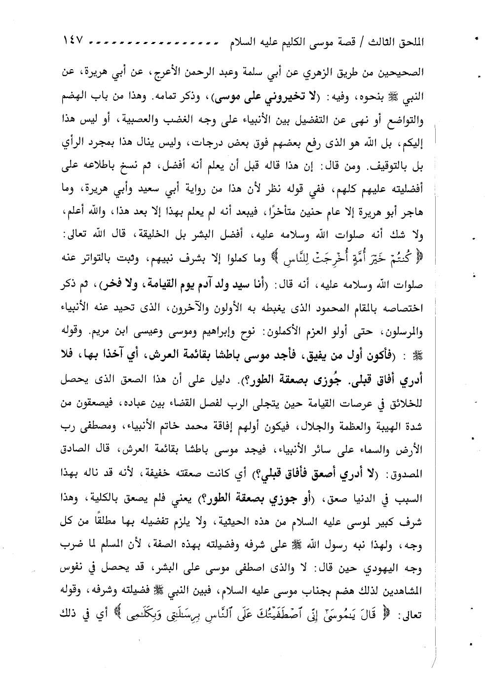 كُنْتُمْ خَيْرَ أُمَّةٍ أُخْرِجَتْ لِلنَّاسِ وما كملوا إلا بشرف نبيهم، وثبت بالتواتر عنه صلوات اللّه وسلامه عليه، أنه قال: (أنا سيد ولد آدم يوم القيامة، ولا فخر)، ثم ذكر اختصاصه بالمقام المحمود الذى يغبطه به الأولون والآخرون، الذى تحيد عنه الأنبياء والمرسلون، حتى أولو العزم الأكملون: نوح وإبراهيم وموسى وعيسى ابن مريم. وقوله صلّى اللّه عليه وسلم: (فأكون أول من يفيق، فأجد موسى باطشا بقائمة العرش، أي آخذا بها، فلا أدري أفاق قبلى. جوزى بصعقة الطور؟). دليل على أن هذا الصعق الذى يحصل للخلائق في عرصات القيامة حين يتجلى الرب لفصل القضاء بين عباده، فيصعقون من شدة الهيبة والعظمة والجلال، فيكون أولهم إفاقة محمد خاتم الأنبياء، ومصطفى رب الأرض والسماء على سائر الأنبياء، فيجد موسى باطشا بقائمة العرش، قال الصادق المصدوق: (لا أدري أصعق فأفاق قبلي؟) أي كانت صعقته خفيفة، لأنه قد ناله بهذا السبب في الدنيا صعق، (أو جوزي بصعقة الطور؟) يعني فلم يصعق بالكلية، وهذا شرف كبير لموسى عليه السلام من هذه الحيثية، ولا يلزم تفضيله بها مطلقا من كل وجه، ولهذا نبه رسول اللّه صلّى اللّه عليه وسلم على شرفه وفضيلته بهذه الصفة، لأن المسلم لما ضرب وجه اليهودي حين قال: لا والذى اصطفى موسى على البشر، قد يحصل في نفوس المشاهدين لذلك هضم بجناب موسى عليه السلام، فبين النبي صلّى اللّه عليه وسلم فضيلته وشرفه، وقوله تعالى: قالَ يا مُوسى إِنِّي اصْطَفَيْتُكَ عَلَى النَّاسِ بِرِسالاتِي وبِكَلامِي أي في ذلك