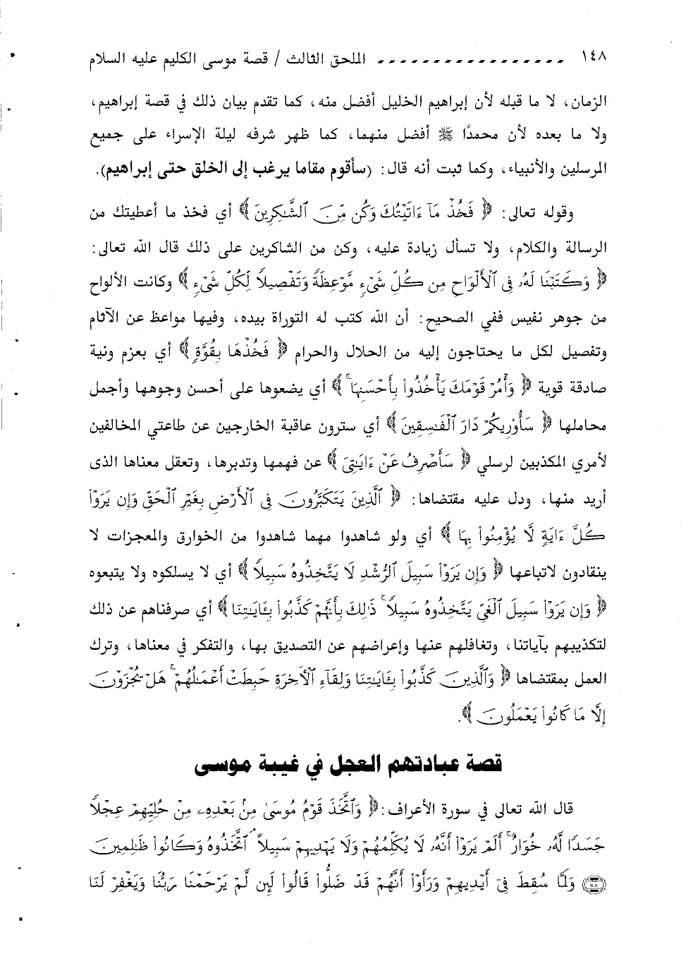 وَكَتَبْنا لَهُ فِي الْأَلْواحِ مِنْ كُلِّ شَيْءٍ مَوْعِظَةً وتَفْصِيلًا لِكُلِّ شَيْءٍ وكانت الألواح من جوهر نفيس ففي الصحيح: أن اللّه كتب له التوراة بيده، وفيها مواعظ عن الآثام وتفصيل لكل ما يحتاجون إليه من الحلال والحرام فَخُذْها بِقُوَّةٍ أي بعزم ونية صادقة قوية وامُرْ قَوْمَكَ يَاخُذُوا بِأَحْسَنِها أي يضعوها على أحسن وجوهها وأجمل محاملها سَأُرِيكُمْ دارَ الْفاسِقِينَ أي سترون عاقبة الخارجين عن طاعتي المخالفين لأمري المكذبين لرسلي سَأَصْرِفُ عَنْ آياتِيَ عن فهمها وتدبرها، وتعقل معناها الذى أريد منها، ودل عليه مقتضاها: الَّذِينَ يَتَكَبَّرُونَ فِي الْأَرْضِ بِغَيْرِ الْحَقِّ وإِنْ يَرَوْا كُلَّ آيَةٍ لا يُؤْمِنُوا بِها أي ولو شاهدوا مهما شاهدوا من الخوارق والمعجزات لا ينقادون لاتباعها وإِنْ يَرَوْا سَبِيلَ الرُّشْدِ لا يَتَّخِذُوهُ سَبِيلًا أي لا يسلكوه ولا يتبعوه وإِنْ يَرَوْا سَبِيلَ الغَيِّ يَتَّخِذُوهُ سَبِيلًا ذلِكَ بِأَنَّهُمْ كَذَّبُوا بِآياتِنا أي صرفناهم عن ذلك لتكذيبهم بآياتنا، وتغافلهم عنها وإعراضهم عن التصديق بها، والتفكر في معناها، وترك العمل بمقتضاها والَّذِينَ كَذَّبُوا بِآياتِنا ولِقاءِ الْآخِرَةِ حَبِطَتْ أَعْمالُهُمْ هَلْ يُجْزَوْنَ إِلَّا ما كانُوا يَعْمَلُونَ.
