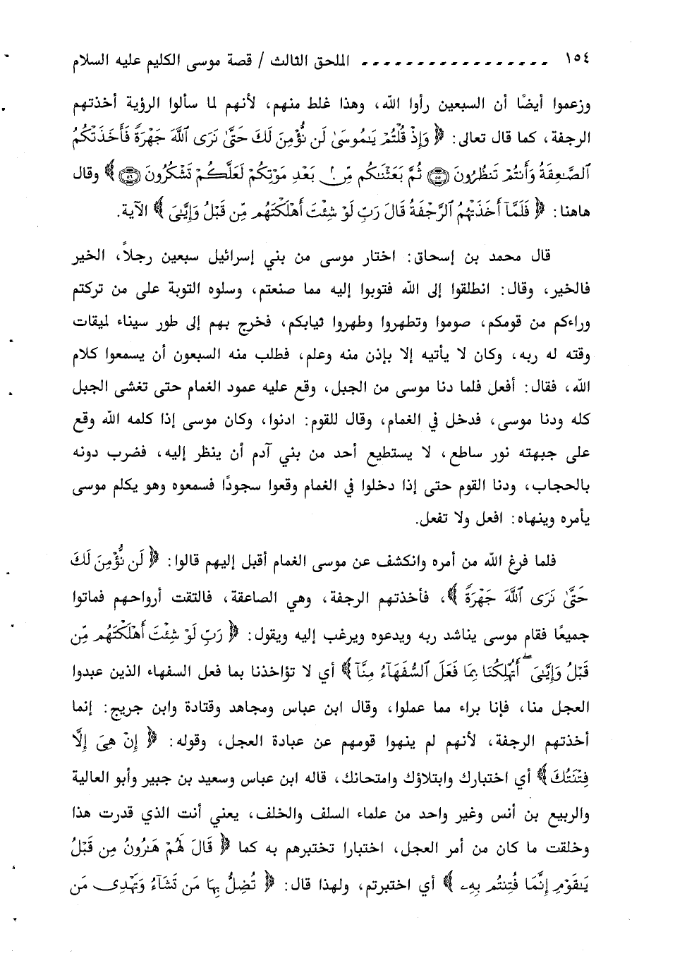فلما فرغ اللّه من أمره وانكشف عن موسى الغمام أقبل إليهم قالوا: لَنْ نُؤْمِنَ لَكَ حَتَّى نَرَى اللَّهَ جَهْرَةً، فأخذتهم الرجفة، وهي الصاعقة، فالتقت أرواحهم فماتوا جميعا فقام موسى يناشد ربه ويدعوه ويرغب إليه ويقول: رَبِّ لَوْ شِئْتَ أَهْلَكْتَهُمْ مِنْ قَبْلُ وإِيَّايَ أَتُهْلِكُنا بِما فَعَلَ السُّفَهاءُ مِنَّا أي لا تؤاخذنا بما فعل السفهاء الذين عبدوا العجل منا، فإنا برآء مما عملوا، وقال ابن عباس ومجاهد وقتادة وابن جريج: إنما أخذتهم الرجفة، لأنهم لم ينهوا قومهم عن عبادة العجل، وقوله: إِنْ هِيَ إِلَّا فِتْنَتُكَ أي اختبارك وابتلاؤك وامتحانك، قاله ابن عباس وسعيد بن جبير وأبو العالية والربيع بن أنس وغير واحد من علماء السلف والخلف، يعني أنت الذي قدرت هذا وخلقت ما كان من أمر العجل، اختبارا تختبرهم به كما قالَ لَهُمْ هارُونُ مِنْ قَبْلُ يا قَوْمِ إِنَّما فُتِنْتُمْ بِهِ أي اختبرتم، ولهذا قال: تُضِلُّ بِها مَنْ تَشاءُ وتَهْدِي مَنْ