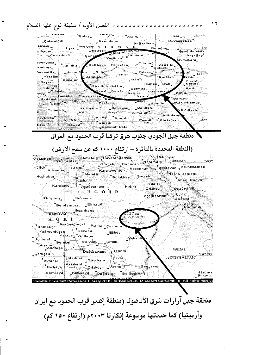 منطقة جبل الجودي جنوب شرق تركيا قرب الحدود مع العراق (المنطقة المحددة بالدائرة - ارتفاع 1000 كم عن سطح الأرض) منطقة جبل آرارات شرق الأناضول (منطقة إكدير قرب الحدود مع إيران وأرمينيا) كما حددتها موسوعة إنكارتا 2003 م (ارتفاع 150 كم)
