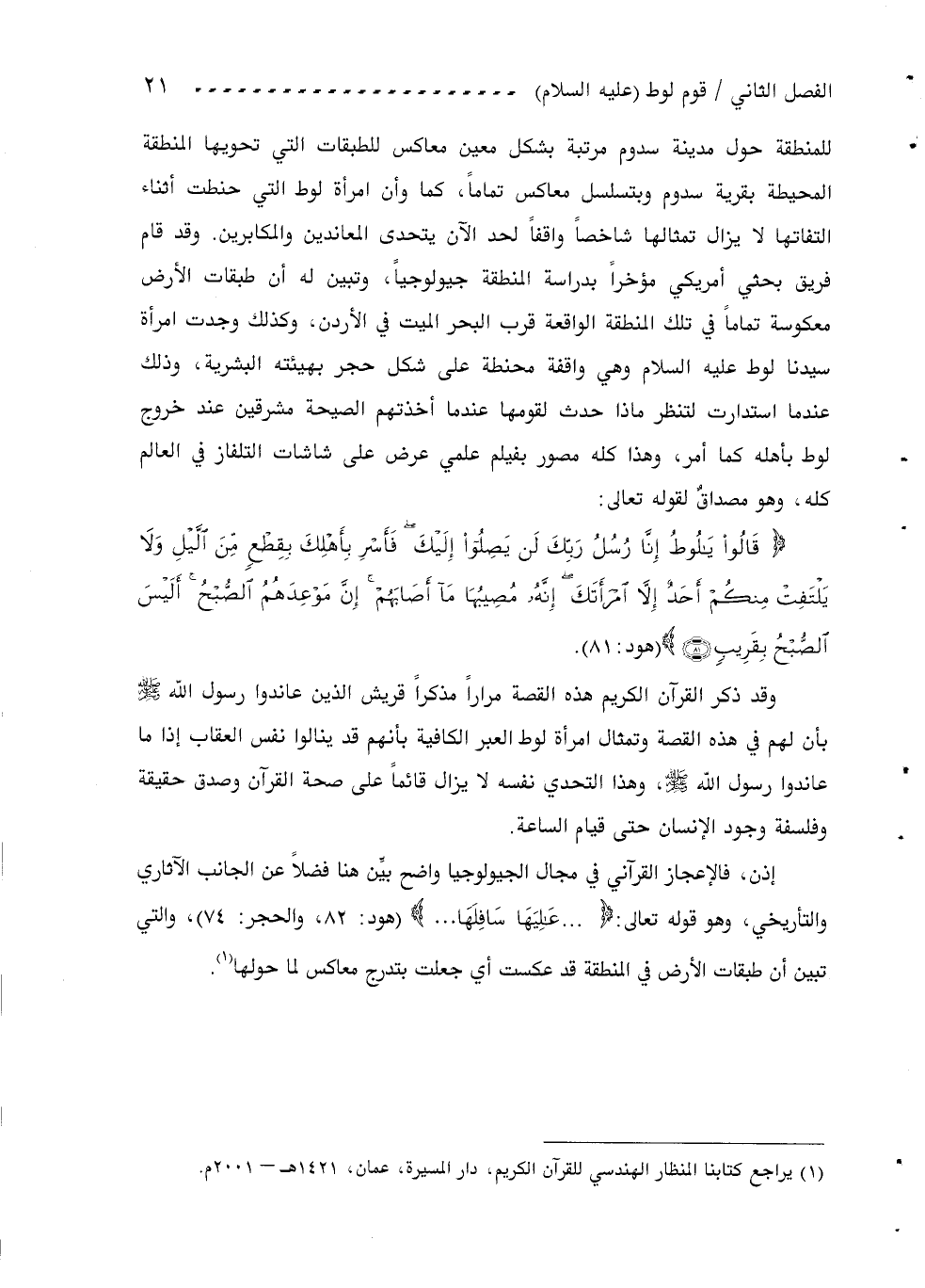 إذن، فالإعجاز القرآني في مجال الجيولوجيا واضح بيّن هنا فضلا عن الجانب الآثاري والتأريخي، وهو قوله تعالى: ... عالِيَها سافِلَها ... (هود: 82، والحجر: 74)، والتي تبين أن طبقات الأرض في المنطقة قد عكست أي جعلت بتدرج معاكس لما حولها «1».