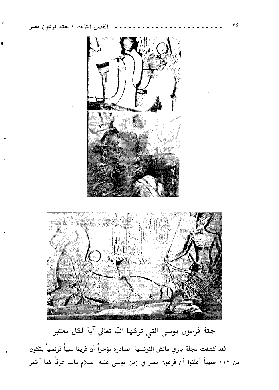 جثة فرعون موسى التي تركها اللّه تعالى آية لكل معتبر فقد كشفت مجلة باري ماتش الفرنسية الصادرة مؤخرا أن فريقا طبيا فرنسيا يتكون من 112 طبيبا أعلنوا أن فرعون مصر في زمن موسى عليه السلام مات غرقا كما أخبر