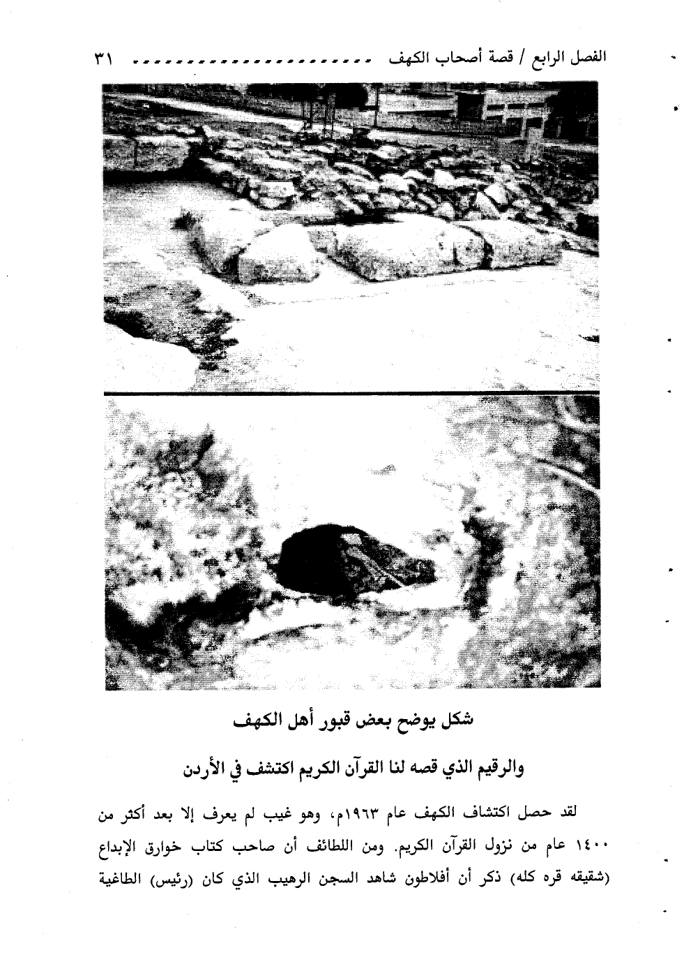 شكل يوضح بعض قبور أهل الكهف والرقيم الذي قصة لنا القرآن الكريم اكتشف في الأردن لقد حصل اكتشاف الكهف عام 1963 م، وهو غيب لم يعرف إلا بعد أكثر من 1400 عام من نزول القرآن الكريم. ومن اللطائف أن صاحب كتاب خوارق الإبداع (شقيقه قره كله) ذكر أن أفلاطون شاهد السجن الرهيب الذي كان (رئيس) الطاغية
